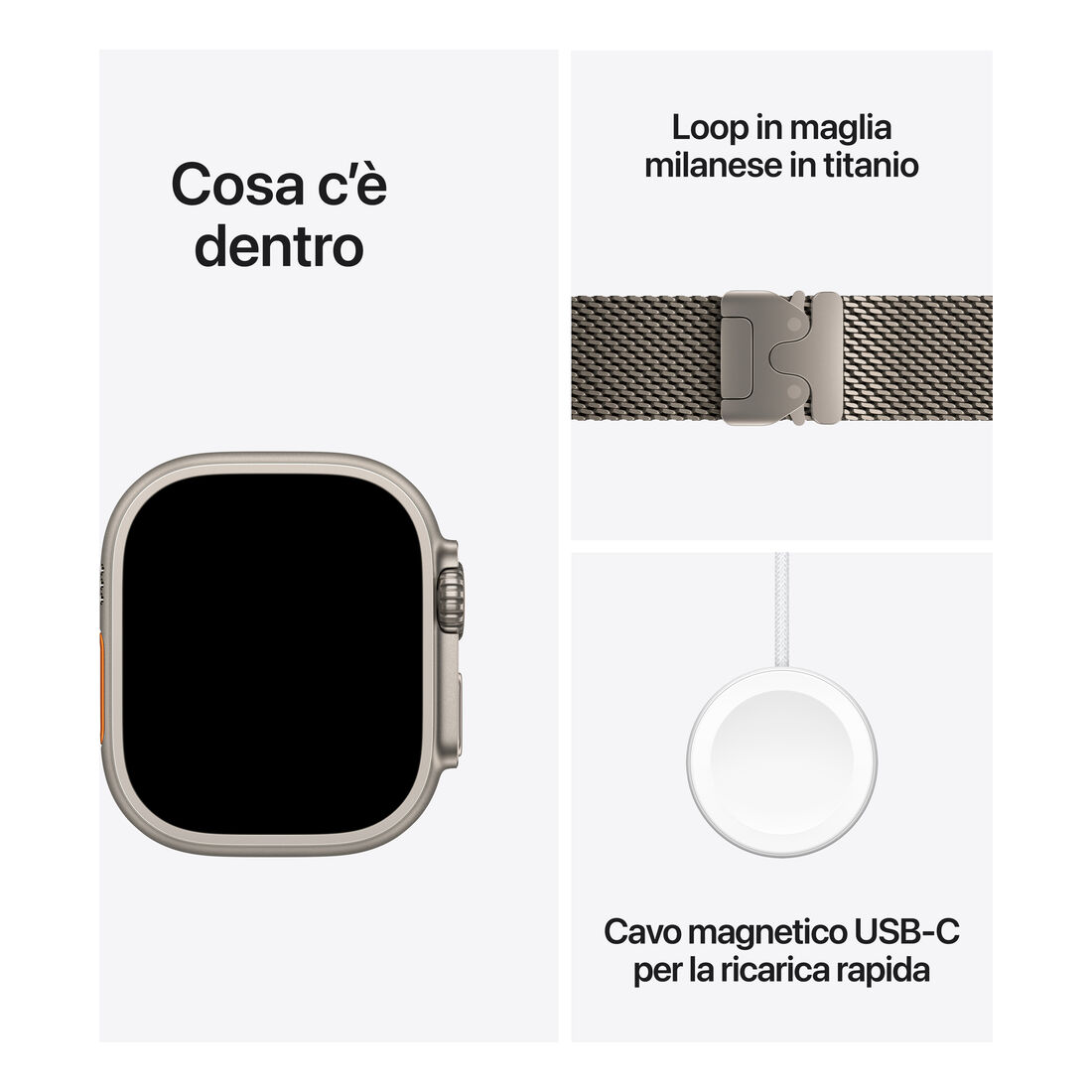 Apple Watch Ultra 2 GPS + Cellular 49mm Cassa in Titanio con Titanio Naturale Milanese Loop – S. Tecnologia display: OLED, Risoluzione del display: 410 x 502 Pixel, Touch screen. Memoria flash: 64 GB. Wi-Fi. GPS (satellitare). Peso: 61,4 g. Impermeabile fino a: 100 m, Colore cinturino: Titanio, Dimensione del cinturino: S. Sistema operativo incluso: watchOS 11