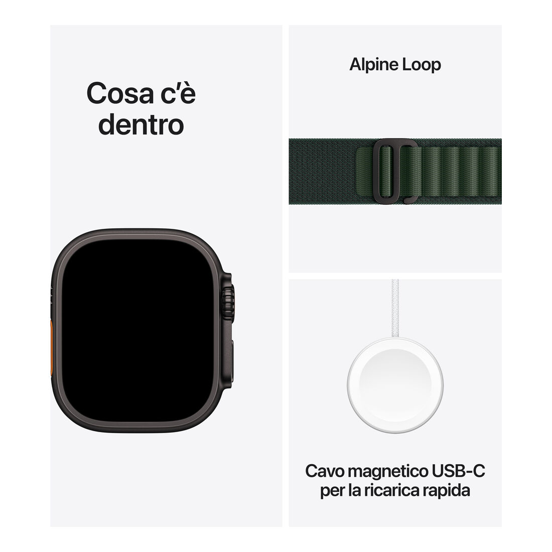 Apple Watch Ultra 2 GPS + Cellular 49mm Cassa Titanio Nero con Dark Green Alpine Loop – Medium. Tecnologia display: OLED, Risoluzione del display: 410 x 502 Pixel, Touch screen. Memoria flash: 64 GB. Wi-Fi. GPS (satellitare). Peso: 61,8 g. Impermeabile fino a: 100 m, Colore cinturino: Verde, Dimensione del cinturino: M. Sistema operativo incluso: watchOS 11