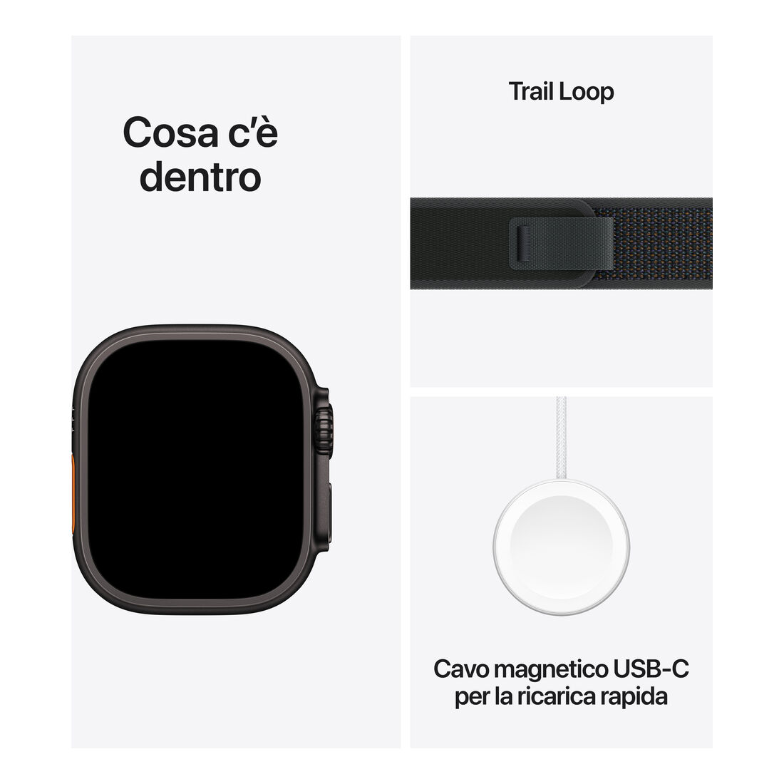 Apple Watch Ultra 2 GPS + Cellular 49mm Cassa Titanio Nero con Nero Trail Loop – S/M. Tecnologia display: OLED, Risoluzione del display: 410 x 502 Pixel, Touch screen. Memoria flash: 64 GB. Wi-Fi. GPS (satellitare). Peso: 61,8 g. Impermeabile fino a: 100 m, Colore cinturino: Nero, Dimensione del cinturino: S/M. Sistema operativo incluso: watchOS 11