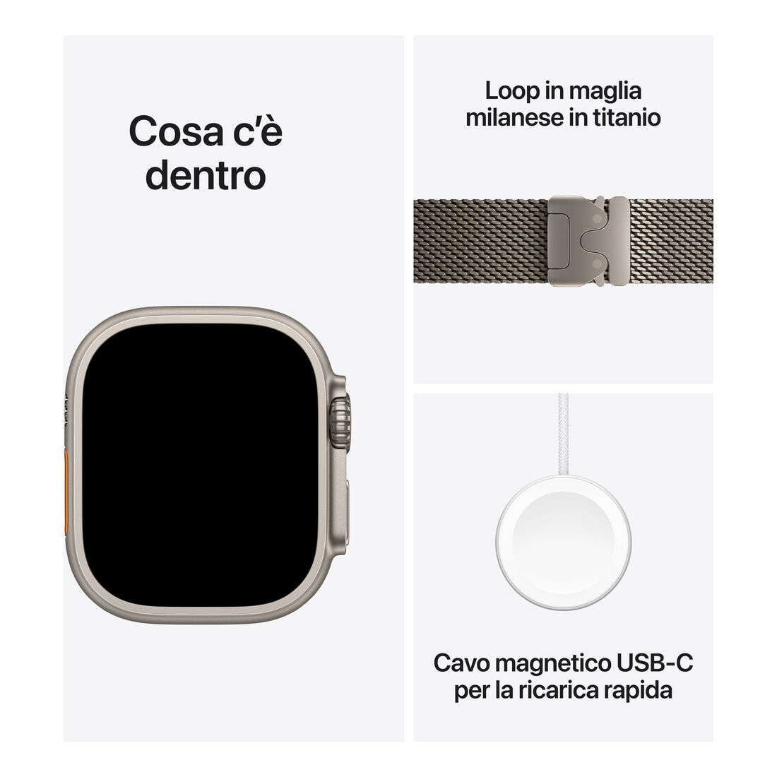 Apple Watch Ultra 3 GPS + Cellular 49mm Cassa Titanio Naturale con Loop in maglia Milanese Titanio – Small. Tecnologia display: OLED, Risoluzione del display: 422 x 514 Pixel, Touch screen. Memoria flash: 64 GB. Wi-Fi. GPS (satellitare). Peso: 61,6 g. Impermeabile fino a: 100 m, Materiale cinturino: Titanio, Colore cinturino: Titanio, Dimensione del cinturino: S. Sistema operativo incluso: watchOS 11