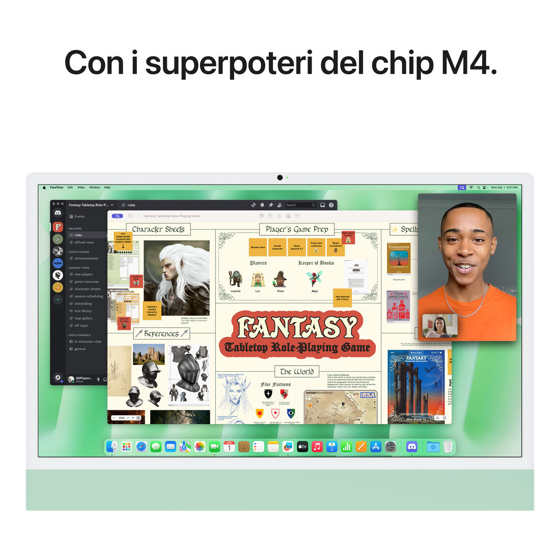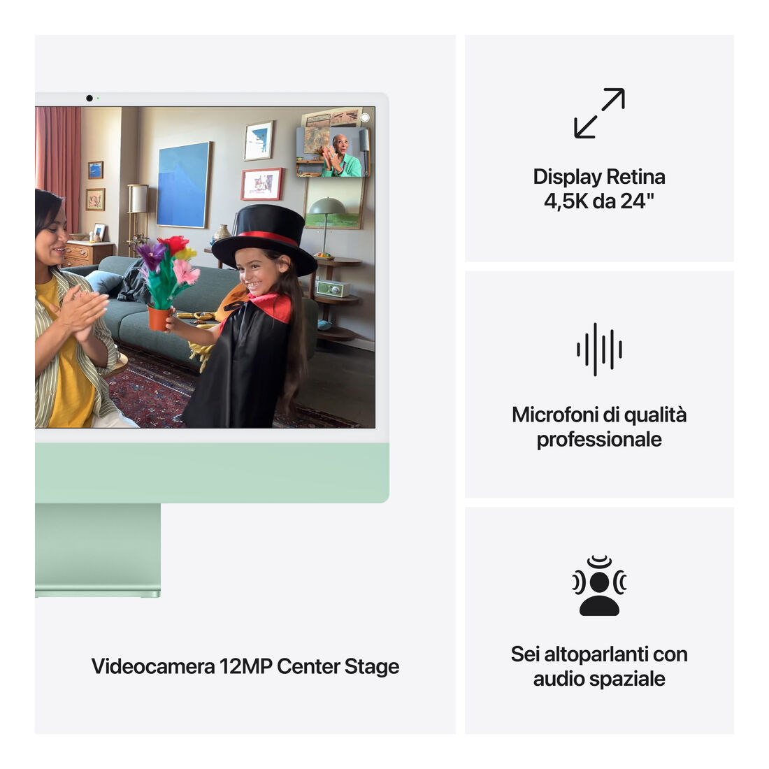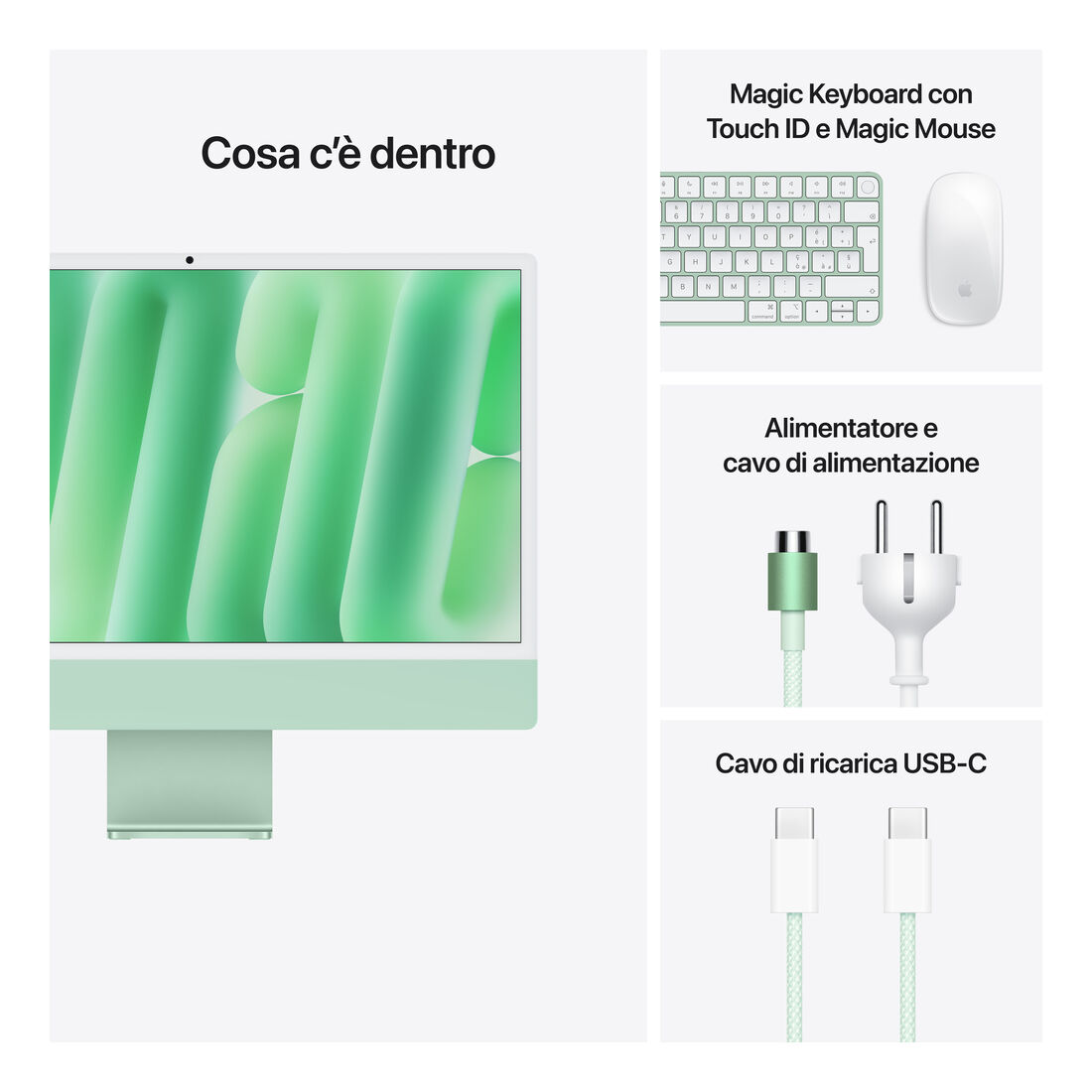Apple iMac 24″Retina Display 4,5K, Chip M4 con CPU 10‑core, GPU 10‑core, 24GB, 512GB SSD, Verde. Tipo di prodotto: PC All-in-one. Dimensioni diagonale schermo: 59,7 cm (23.5″), Tipologia HD: 4.5K Ultra HD, Risoluzione del display: 4480 x 2520 Pixel. Famiglia processore: Apple M. RAM installata: 24 GB. Capacità totale di archiviazione: 512 GB, Supporto di memoria: SSD. Modello scheda grafica integrata: Apple GPU. Fotocamera integrata. Sistema operativo incluso: macOS Sequoia. Colore del prodotto: Verde