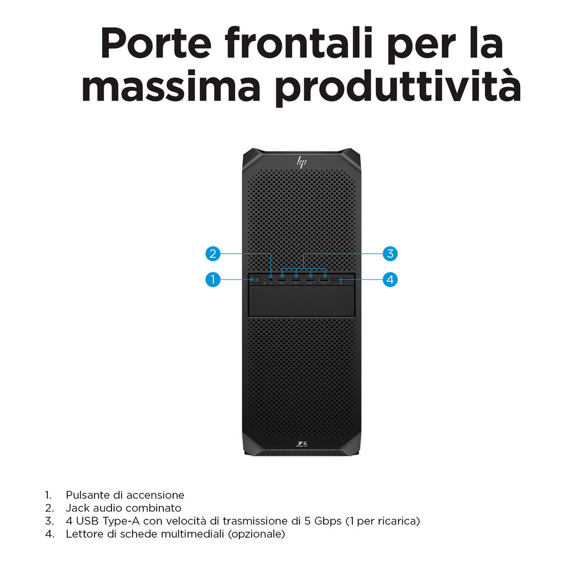 HP Z6 G5 A. Frequenza del processore: 4,5 GHz, Famiglia processore: AMD Ryzen Threadripper PRO, Modello del processore: 7955WX. RAM installata: 64 GB, Tipo di RAM: DDR5-SDRAM, Velocità memoria: 5600 MHz. Capacità totale di archiviazione: 2 TB, Supporto di memoria: SSD. Sistema operativo incluso: Windows 11 Pro. Alimentazione: 1450 W. Tipo di case: Tower. Tipo di prodotto: Stazione di lavoro. Peso: 13,2 kg. Colore del prodotto: Nero
