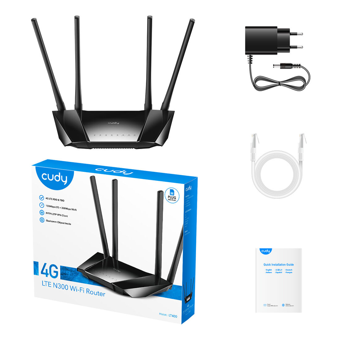 Cudy LT400. Tipo di connessione WAN: RJ-45. Banda Wi-Fi: Banda singola (2.4 GHz), Wi-Fi standard: Wi-Fi 4 (802.11n), Intervallo di trasferimento dei dati WLAN (max): 300 Mbit/s. Tipo di interfaccia LAN Ethernet: Fast Ethernet, Velocità trasferimento Ethernet LAN: 10,100 Mbit/s, Tecnologia di cablaggio: 10/100Base-T(X). Generazione di reti mobili: 4G, Standard 2G: Edge, GSM, Standard 3G: DC-HSPA+, HSPA, HSPA+, UMTS, WCDMA. Tipo di prodotto: Router da tavolo/palo, Colore del prodotto: Nero, Indicatori LED: LAN, WAN