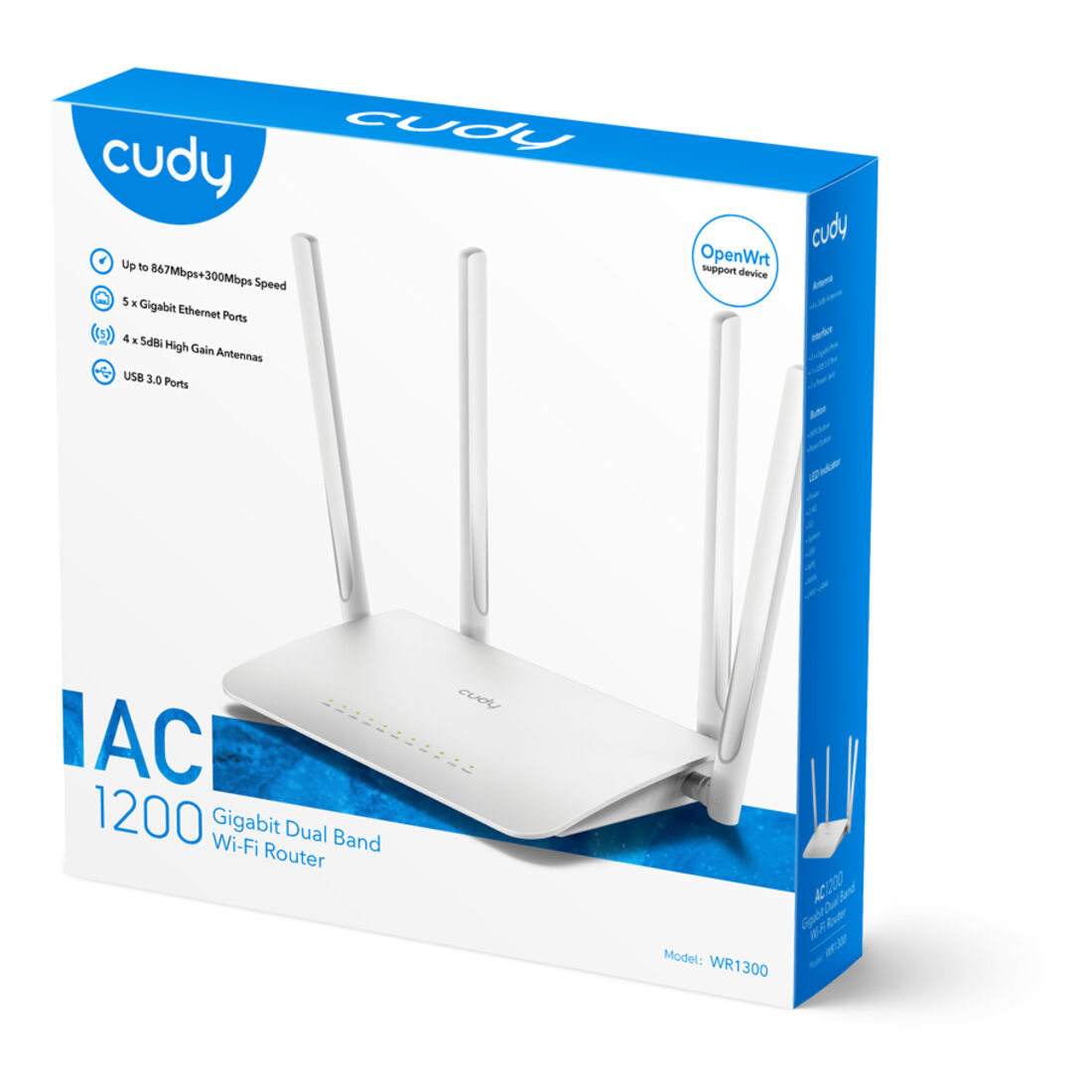 Cudy WR1300. Tipo di connessione WAN: RJ-45. Banda Wi-Fi: Dual-band (2.4 GHz/5 GHz), Wi-Fi standard: Wi-Fi 5 (802.11ac), Intervallo di trasferimento dei dati WLAN (max): 867 Mbit/s. Tipo di interfaccia LAN Ethernet: Gigabit Ethernet, Velocità trasferimento Ethernet LAN: 10,100,1000 Mbit/s, Supporto VPN: PPTP/L2TP/OpenVPN/WireGuard. Algoritmi di sicurezza supportati: WEP, WPA, WPA-PSK, WPA2, WPA2-PSK. Tipo di prodotto: Router da tavolo, Colore del prodotto: Bianco, Indicatori LED: LAN, Potenza, status, WPS