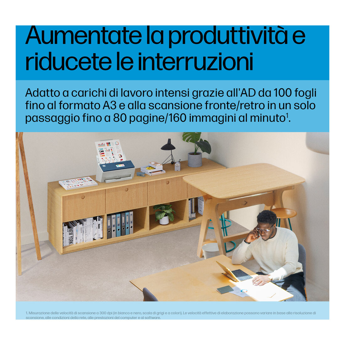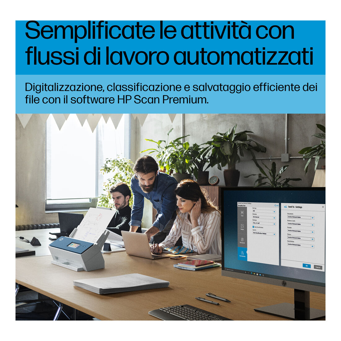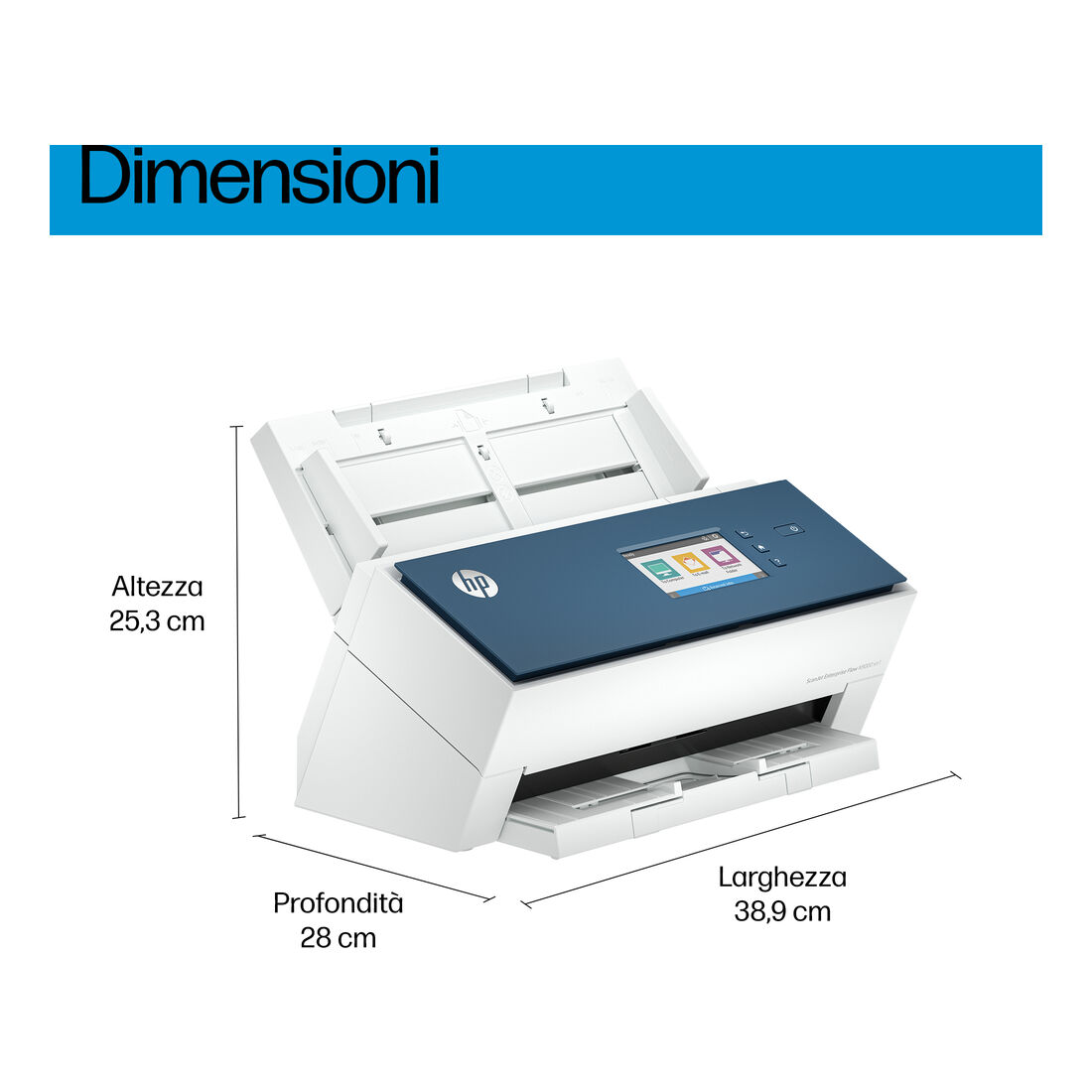 HP ScanJet Enterprise Flow N9000 sn1. Massima dimensione di scansione: 297 x 5842 mm, Risoluzione di scansione ottica: 600 x 600 DPI, Profondità di scansione del colore in entrata: 48 bit. Tipo di scansione: Scanner ADF, Colore del prodotto: Blu, Bianco, Dimensioni diagonale schermo: 10,9 cm (4.3″). Tipo sensore: CMOS CIS, Ciclo di funzionamento quotidiano (max): 30000 pagine, Fonte di luce: LED. Capacità documenti: 100 fogli. Massimo formato carta serie ISO A: A3, Dimensioni ISO serie-A (A0…A9): A3, A4, A5, A6, A7, A8, Dimensioni ISO serie-B (B0…B9): B5