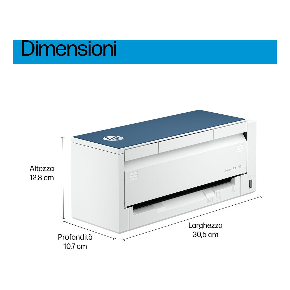 HP ScanJet Pro 4200 s1. Massima dimensione di scansione: 1200 x 1200 mm, Risoluzione di scansione ottica: 600 x 600 DPI, Profondità di scansione del colore in entrata: 48 bit. Tipo di scansione: Scanner ADF, Colore del prodotto: Blu, Bianco. Tipo sensore: CIS, Ciclo di funzionamento quotidiano (max): 4500 pagine, Formati file scanner: BMP, CSV, DOC, DOCX, JPEG, PDF, RTF, TXT, XLSX. Capacità documenti: 50 fogli. Massimo formato carta serie ISO A: A4, Dimensioni ISO serie-A (A0…A9): A4, A5, A6, A7, A8