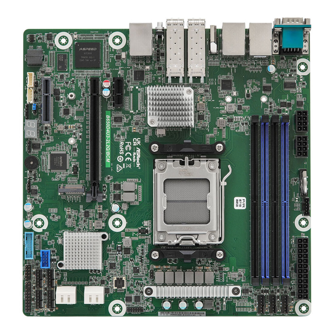 Asrock B650D4U3-2L2Q/BCM. Produttore processore: AMD, Presa per processore: Socket AM5, Processori compatibili: AMD EPYC 4004, AMD Ryzen 7000 Series, AMD Ryzen 8000 Series, AMD Ryzen 9000 Series. Tipi di memoria supportati: DDR5-SDRAM, RAM massima supportata: 48 GB, tipo di slot di memoria: DIMM. Interfacce dell’unità di archiviazione supportate: M.2, SATA III. Modello scheda grafica integrata: Aspeed AST2600. Componente per: Server, Fattore di forma scheda madre: micro ATX, Famiglia di chipset per scheda madre: AMD