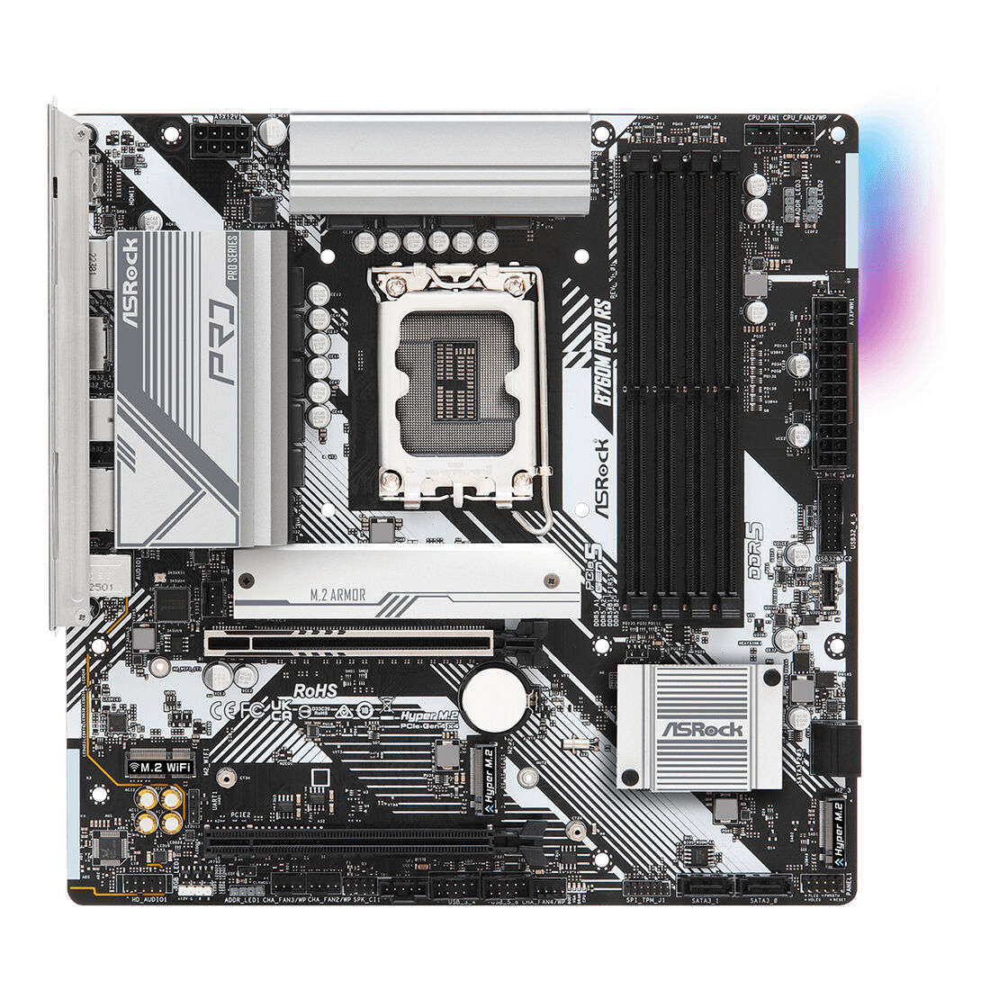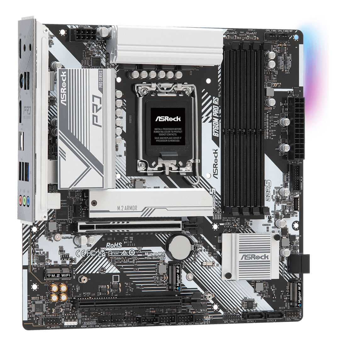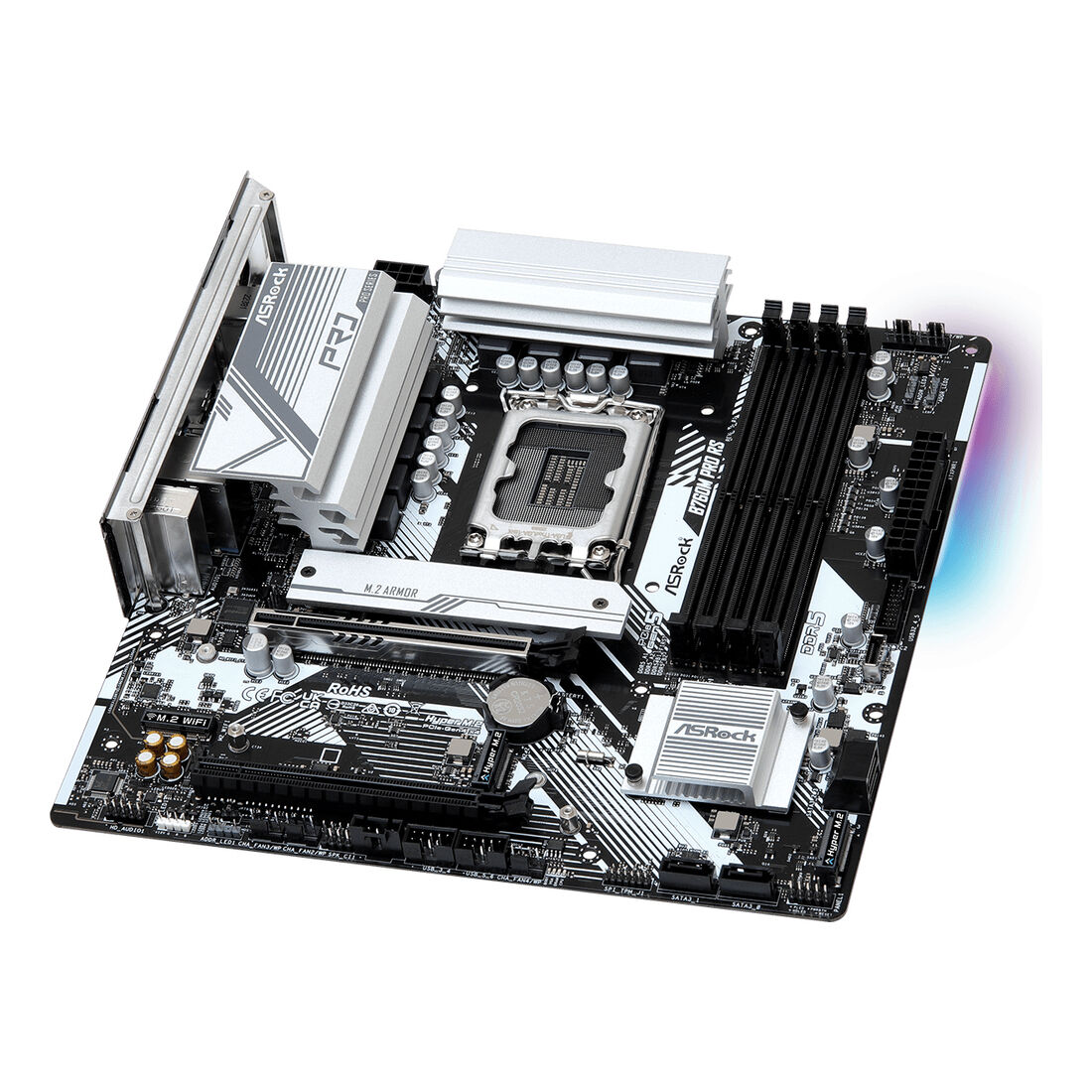 Asrock B760M Pro RS. Produttore processore: Intel, Presa per processore: LGA 1700, Processori compatibili: Intel® Core™ i5, Intel® Core™ i7, Intel® Core™ i9. Tipi di memoria supportati: DDR5-SDRAM, RAM massima supportata: 192 GB, tipo di slot di memoria: DIMM. Interfacce dell’unità di archiviazione supportate: M.2, SATA III, Tipi di unità di archiviazione supportate: HDD & SSD. Tipo di interfaccia Ethernet: 2.5 Gigabit Ethernet, Controller LAN: Realtek RTL8125-BG. Componente per: PC, Fattore di forma scheda madre: micro ATX, Famiglia di chipset per scheda madre: Intel