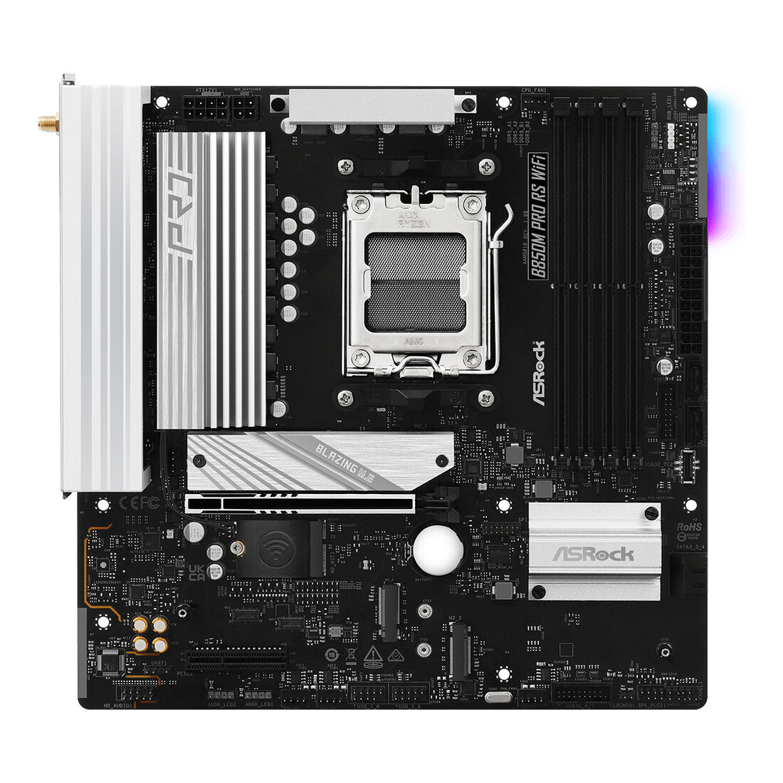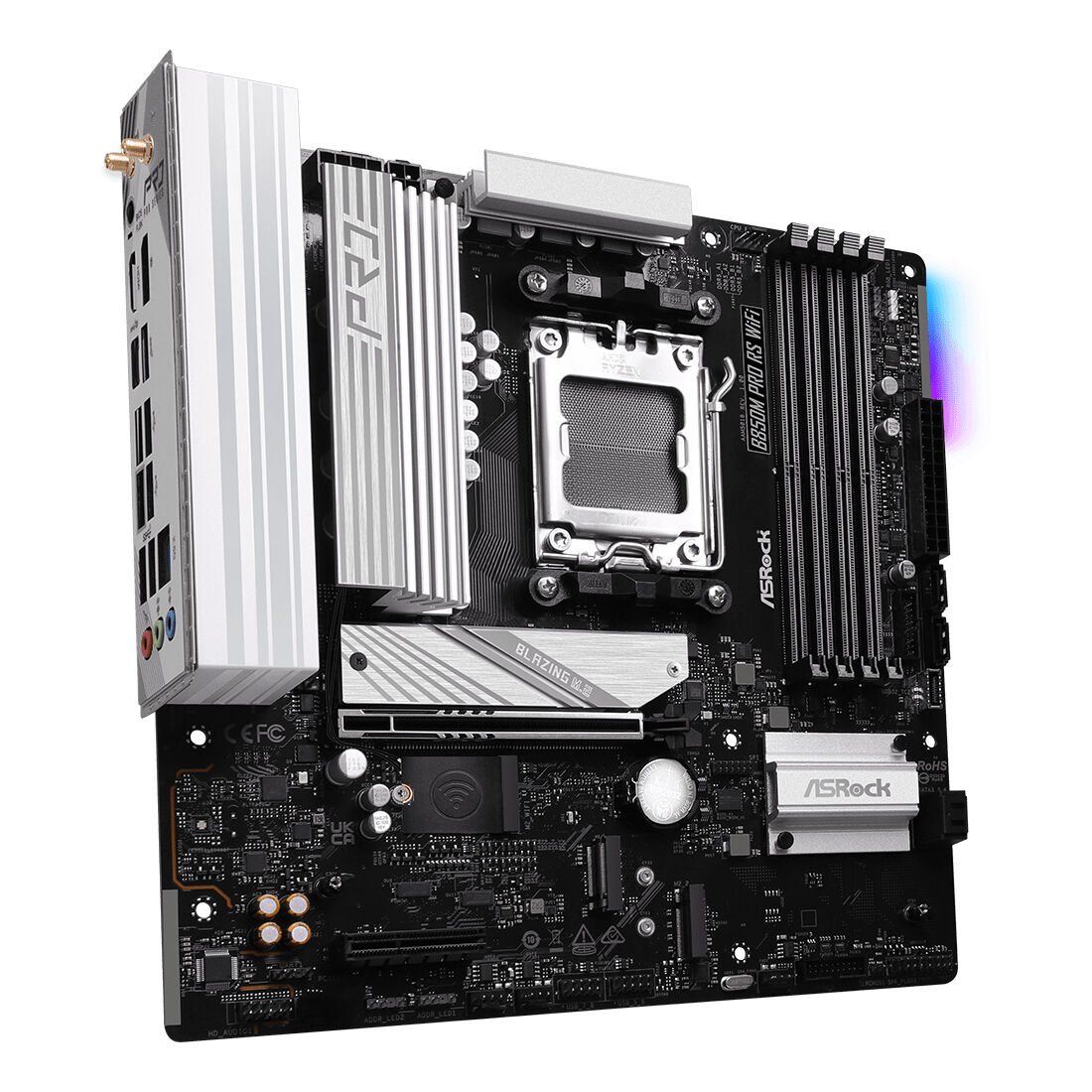 Asrock B850M Pro RS WiFi. Produttore processore: AMD, Presa per processore: Socket AM5, Processori compatibili: AMD Ryzen 7000 Series, AMD Ryzen 8000 Series, AMD Ryzen 9000 Series. Tipi di memoria supportati: DDR5-SDRAM, RAM massima supportata: 256 GB, tipo di slot di memoria: DIMM. Interfacce dell’unità di archiviazione supportate: PCI Express 4.0, PCI Express 5.0, SATA III, Tipi di unità di archiviazione supportate: HDD & SSD, Livelli RAID: 0, 1, 10. Risoluzione massima: 3840 x 2160 Pixel. Connettore USB: USB tipo A, USB tipo-C