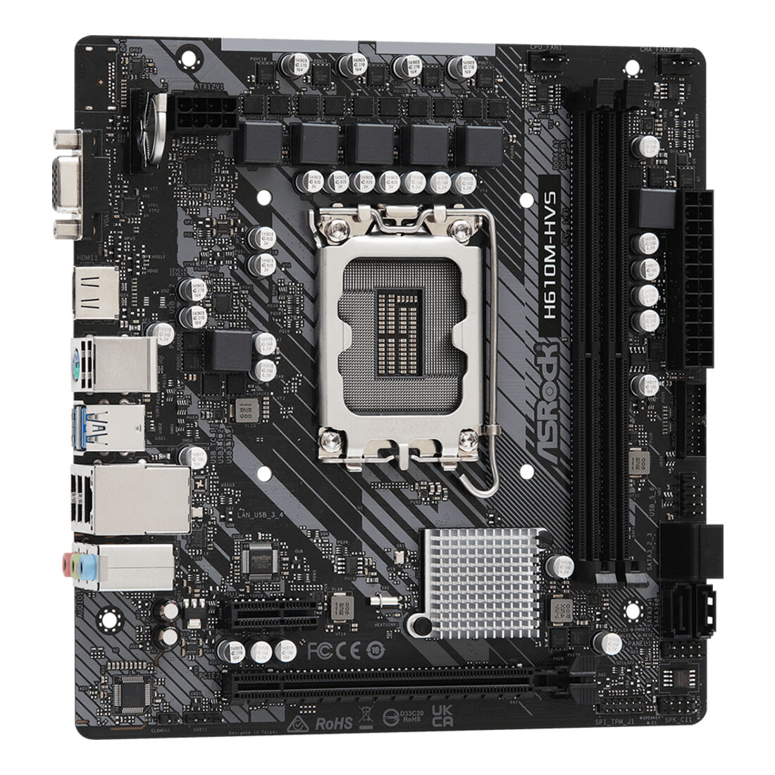 Asrock H610M-HVS. Produttore processore: Intel, Presa per processore: LGA 1700, Processori compatibili: Intel® Celeron®, Intel® Core™ i3, Intel® Core™ i5, Intel® Core™ i7, Intel® Core™ i9, Intel® Pentium®. Tipi di memoria supportati: DDR4-SDRAM, RAM massima supportata: 64 GB, Compatibilità ECC: ECC & Non-ECC. Interfacce dell’unità di archiviazione supportate: SATA III, Tipi di unità di archiviazione supportate: HDD & SSD. Risoluzione massima: 4096 x 2160 Pixel. Tipo di interfaccia Ethernet: Gigabit Ethernet, Controller LAN: Realtek RTL8111H
