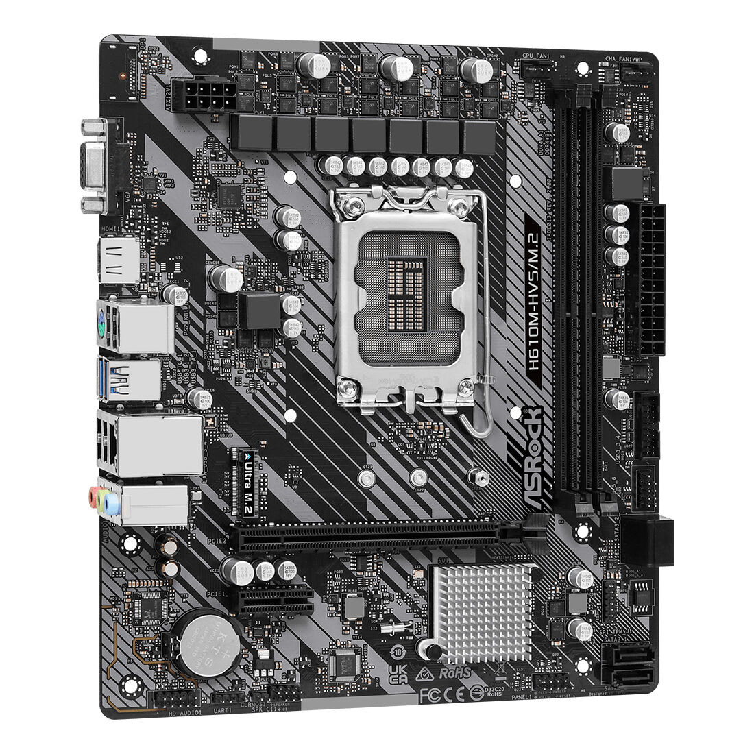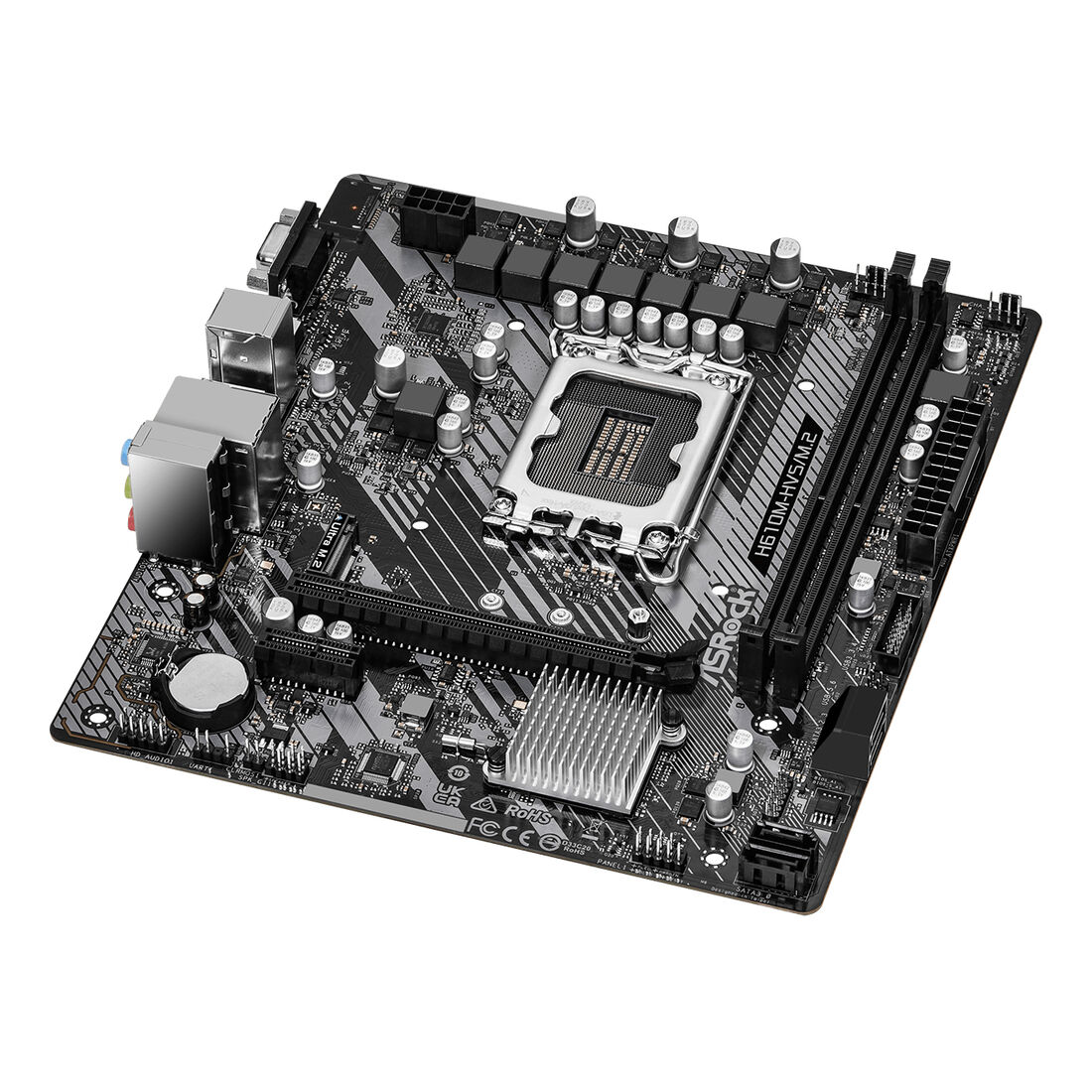 Asrock H610M-HVS/M.2 R2.0. Produttore processore: Intel, Presa per processore: LGA 1700, Processori compatibili: Intel® Core™ i3, Intel® Core™ i5, Intel® Core™ i7. Tipi di memoria supportati: DDR4-SDRAM, RAM massima supportata: 64 GB, tipo di slot di memoria: DIMM. Interfacce dell’unità di archiviazione supportate: M.2, SATA III, Tipi di unità di archiviazione supportate: HDD & SSD. Risoluzione massima: 4096 x 2160 Pixel. Tipo di interfaccia Ethernet: Gigabit Ethernet, Controller LAN: Realtek RTL8111H