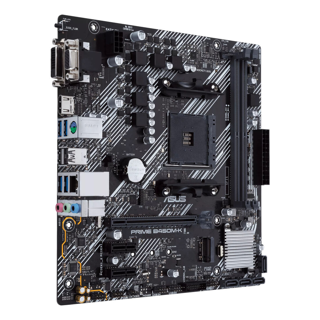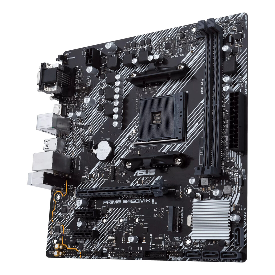 ASUS Prime B450M-K II. Produttore processore: AMD, Presa per processore: Socket AM4, Processori compatibili: AMD Ryzen 2000 Series, AMD Ryzen Threadripper 1000 Series, AMD Ryzen Threadripper 2000 Series. Tipi di memoria supportati: DDR4-SDRAM, RAM massima supportata: 64 GB, tipo di slot di memoria: DIMM. Interfacce dell’unità di archiviazione supportate: M.2, PCI Express 3.0, SATA III, Livelli RAID: 0, 1, 10. Tipo di interfaccia Ethernet: Gigabit Ethernet. Componente per: PC, Fattore di forma scheda madre: micro ATX, Famiglia di chipset per scheda madre: AMD