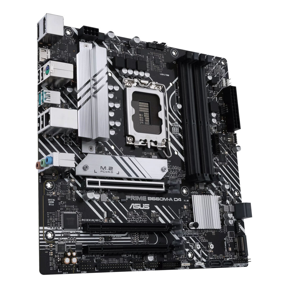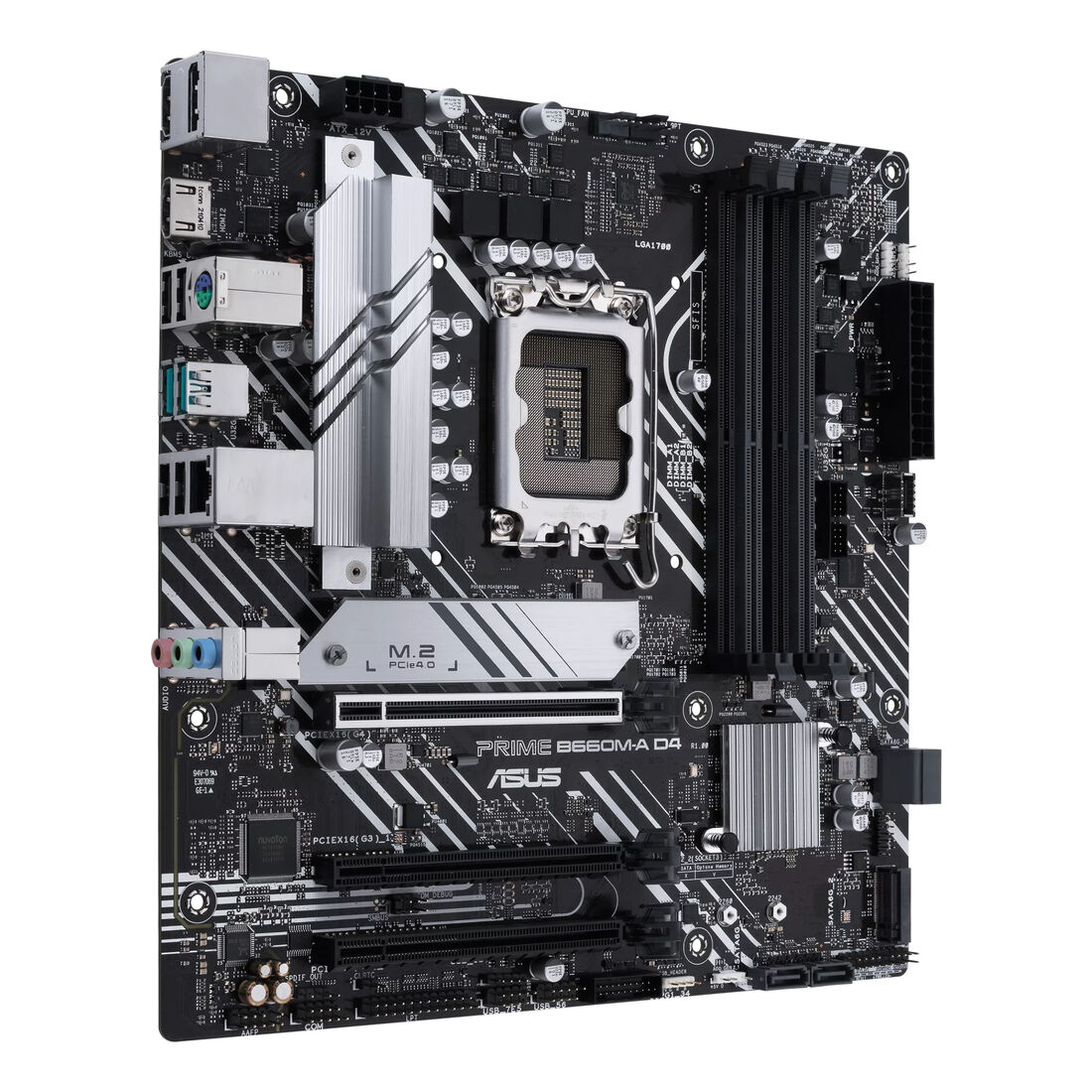 ASUS PRIME B660M-A D4-CSM. Produttore processore: Intel, Presa per processore: LGA 1700, Processori compatibili: Intel® Celeron®, Intel® Core™ i3, Intel® Core™ i5, Intel® Core™ i7, Intel® Core™ i9,…. Tipi di memoria supportati: DDR4-SDRAM, RAM massima supportata: 128 GB, tipo di slot di memoria: DIMM. Interfacce dell’unità di archiviazione supportate: M.2, SATA III, Tipi di unità di archiviazione supportate: HDD & SSD, Livelli RAID: 0, 1, 5, 10. Tipo di interfaccia Ethernet: Gigabit Ethernet. Componente per: PC, Fattore di forma scheda madre: micro ATX, Famiglia di chipset per scheda madre: Intel