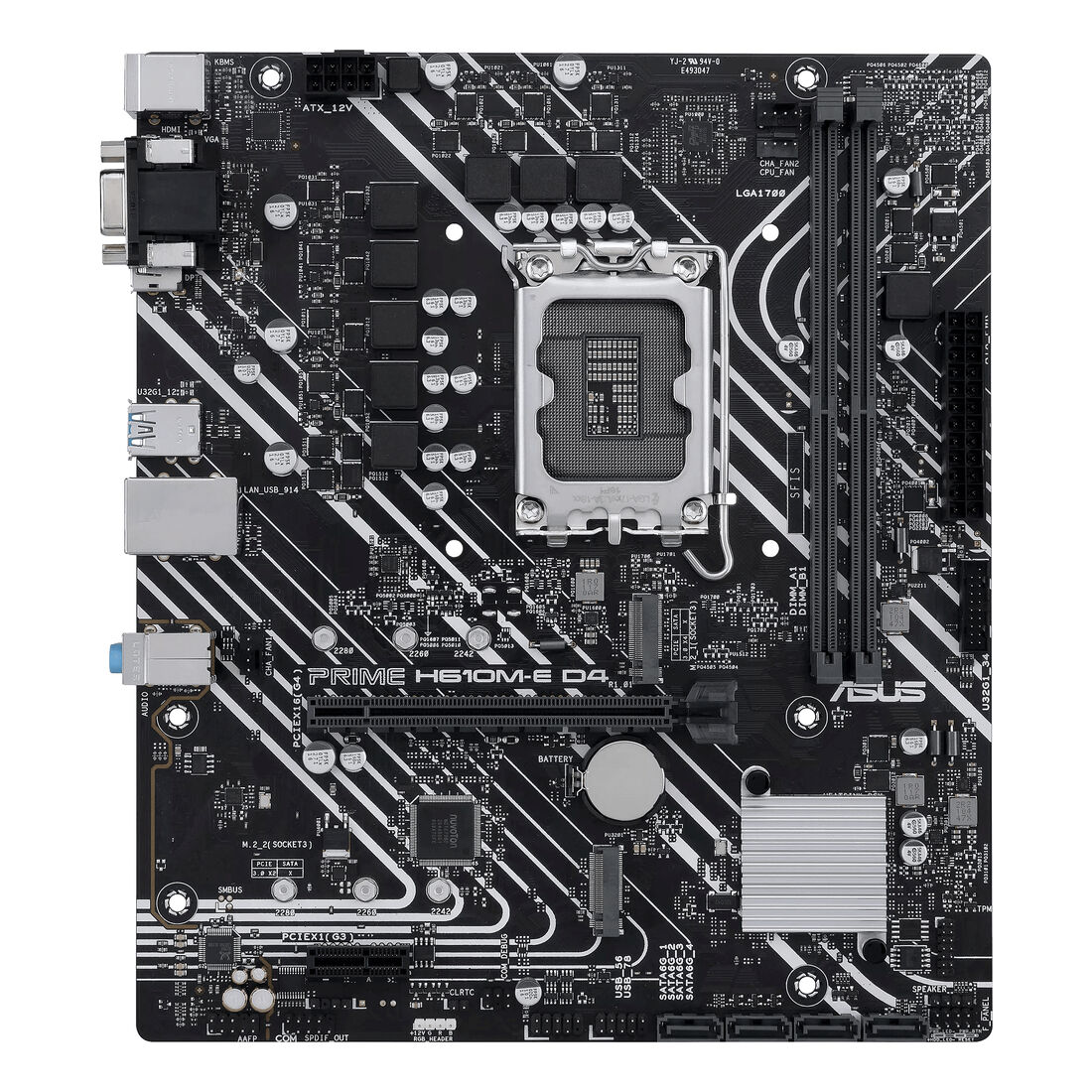 ASUS PRIME H610M-E D4-CSM. Produttore processore: Intel, Presa per processore: LGA 1700, Processori compatibili: Intel® Celeron®, Intel® Core™ i3, Intel® Core™ i5, Intel® Core™ i7, Intel® Core™ i9, Intel® Pentium®. Tipi di memoria supportati: DDR4-SDRAM, RAM massima supportata: 64 GB, tipo di slot di memoria: DIMM. Tipo di interfaccia Ethernet: Gigabit Ethernet. Componente per: PC, Fattore di forma scheda madre: micro ATX, Famiglia di chipset per scheda madre: Intel. Larghezza: 244 mm, Profondità: 211 mm, Altezza: 221 mm