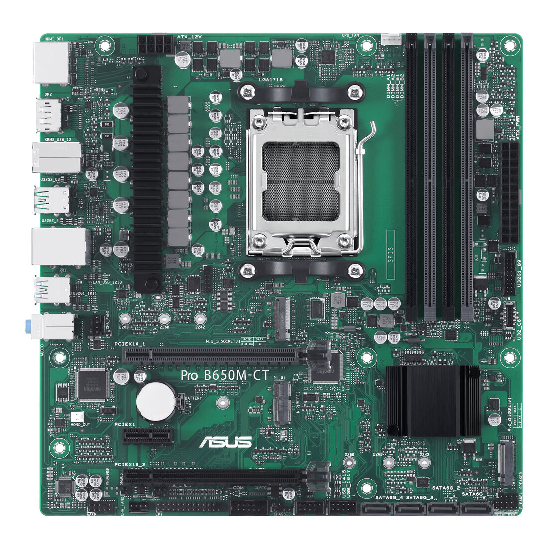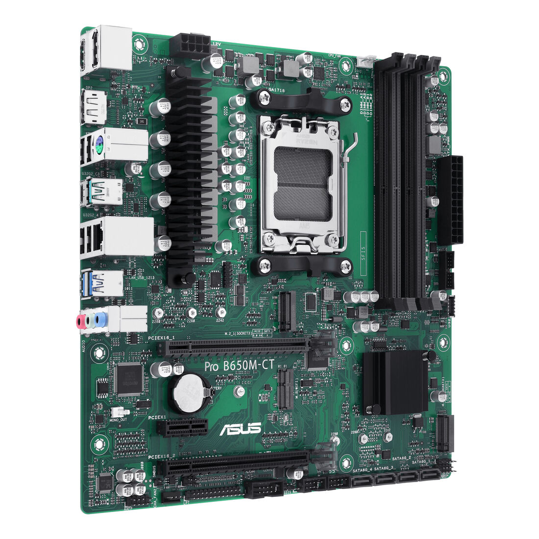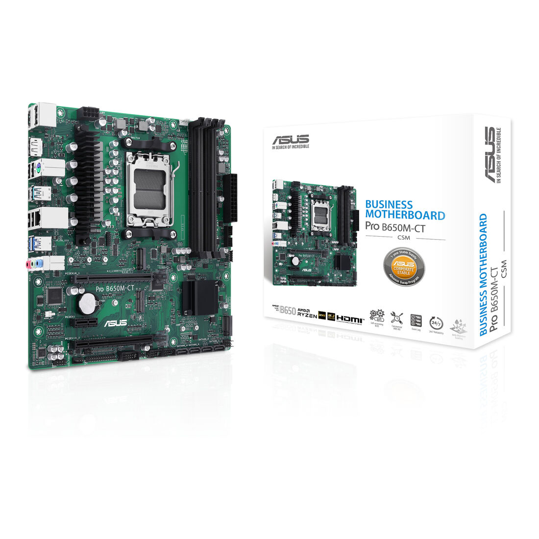 ASUS PRO B650M-CT-CSM. Produttore processore: AMD, Presa per processore: Socket AM5, Processori compatibili: AMD Ryzen 7000 Series. Tipi di memoria supportati: DDR5-SDRAM, RAM massima supportata: 128 GB, tipo di slot di memoria: DIMM. Interfacce dell’unità di archiviazione supportate: M.2, SATA III, Tipi di unità di archiviazione supportate: HDD & SSD, Livelli RAID: 0, 1, 10. Tipo di interfaccia Ethernet: Gigabit Ethernet. Componente per: PC, Fattore di forma scheda madre: micro ATX, Famiglia di chipset per scheda madre: AMD