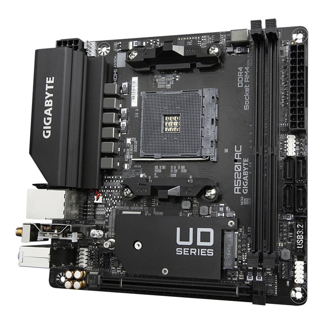 GIGABYTE A520I AC Scheda madre – Supporta CPU AMD Ryzen 5000 Series AM4, VRM digitale a 6 fasi, fino a 5300MHz DDR4 (OC), 1xPCIe 3.0 M.2, WIFI, GbE LAN, USB 3.2 Gen1. Produttore processore: AMD, Presa per processore: Socket AM4, Processori compatibili: AMD Ryzen 3000 Series. Tipi di memoria supportati: DDR4-SDRAM, RAM massima supportata: 64 GB, tipo di slot di memoria: DIMM. Interfacce dell’unità di archiviazione supportate: M.2, SATA III, Livelli RAID: 0, 1, 10. Risoluzione massima: 5120 x 2880 Pixel. Tipo di interfaccia Ethernet: Gigabit Ethernet, Wi-Fi standard: Wi-Fi 5 (802.11ac), Standard Wi-Fi: 802.11a, 802.11b, 802.11g, Wi-Fi 4 (802.11n), Wi-Fi 5 (802.11ac)