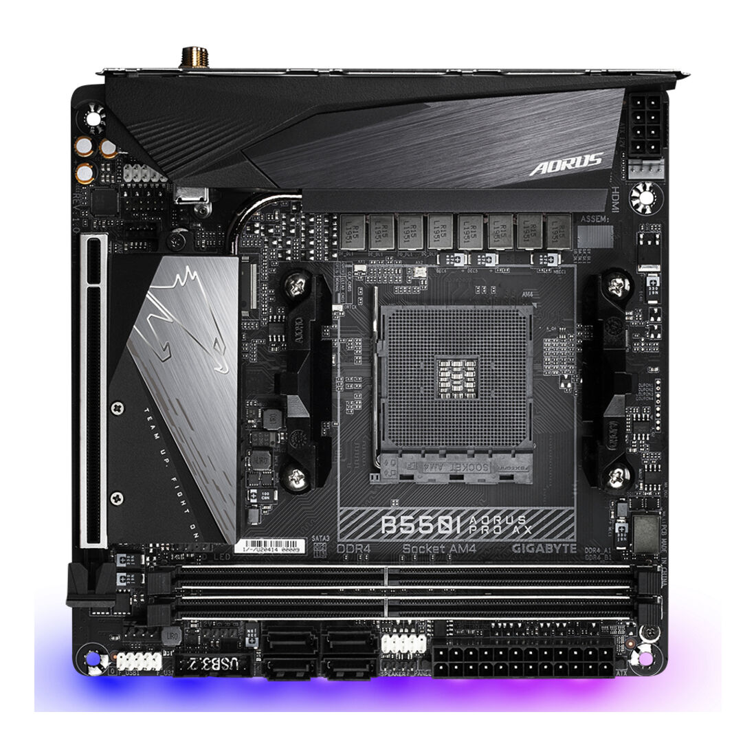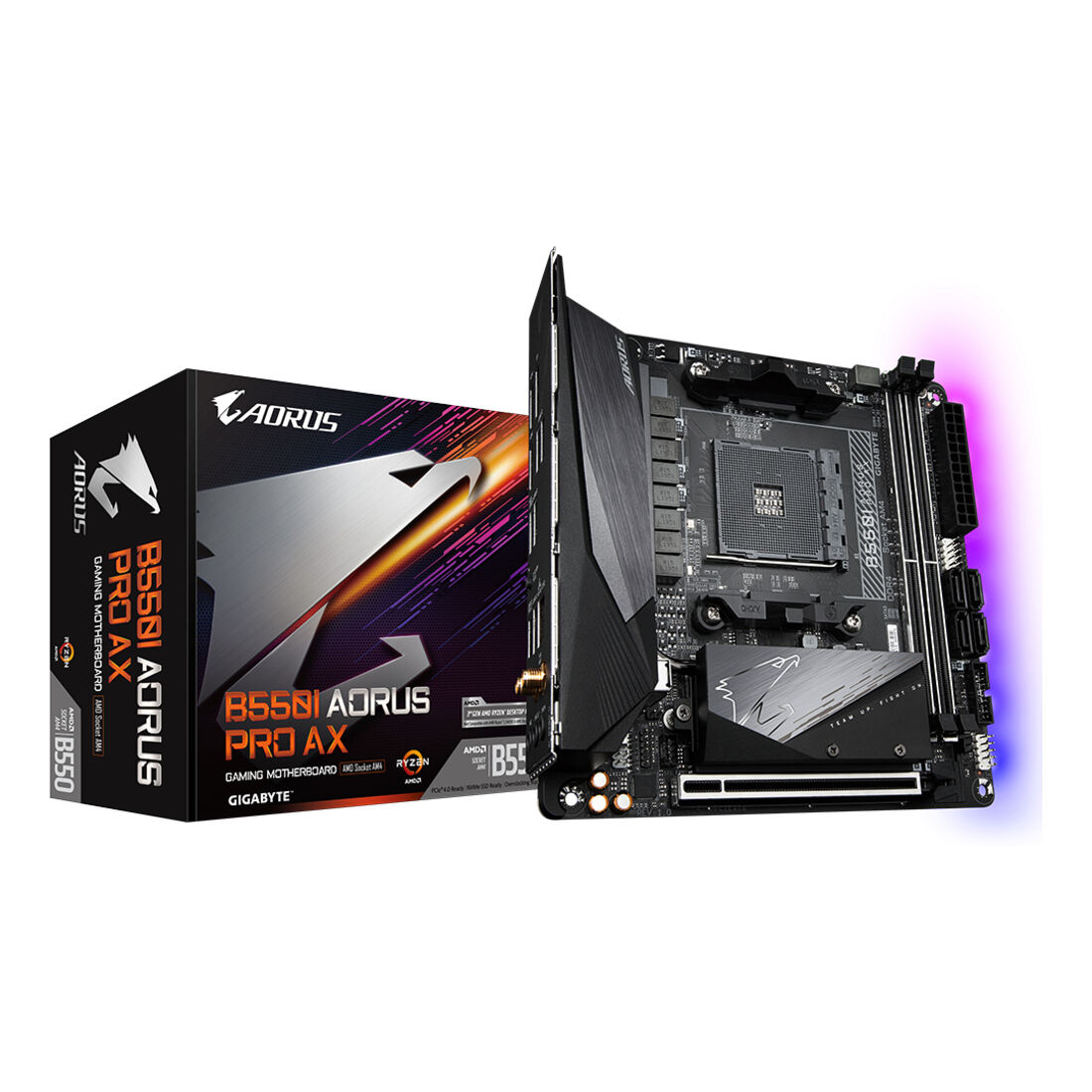 GIGABYTE B550I AORUS PRO AX Scheda madre – CPU AMD Ryzen 5000, VRM a 8 fasi, fino a 5300 MHz DDR4, 1xPCIe 4.0 + 1xPCIe 3.0 M.2, Wi-Fi 6E, LAN 2.5GbE, USB 3.2 Gen 2. Produttore processore: AMD, Presa per processore: Socket AM4, Processori compatibili: AMD Ryzen 3000 Series, AMD Ryzen 4000 Series, AMD Ryzen 5000 Series. Tipi di memoria supportati: DDR4-SDRAM, RAM massima supportata: 64 GB, tipo di slot di memoria: DIMM. Interfacce dell’unità di archiviazione supportate: M.2, SATA, Tipi di unità di archiviazione supportate: HDD & SSD, Livelli RAID: 0, 1, 10. Risoluzione massima: 5120 x 2880 Pixel. Tipo di interfaccia Ethernet: 2.5 Gigabit Ethernet, Controller LAN: Realtek RTL8125, Wi-Fi standard: Wi-Fi 6E (802.11ax)