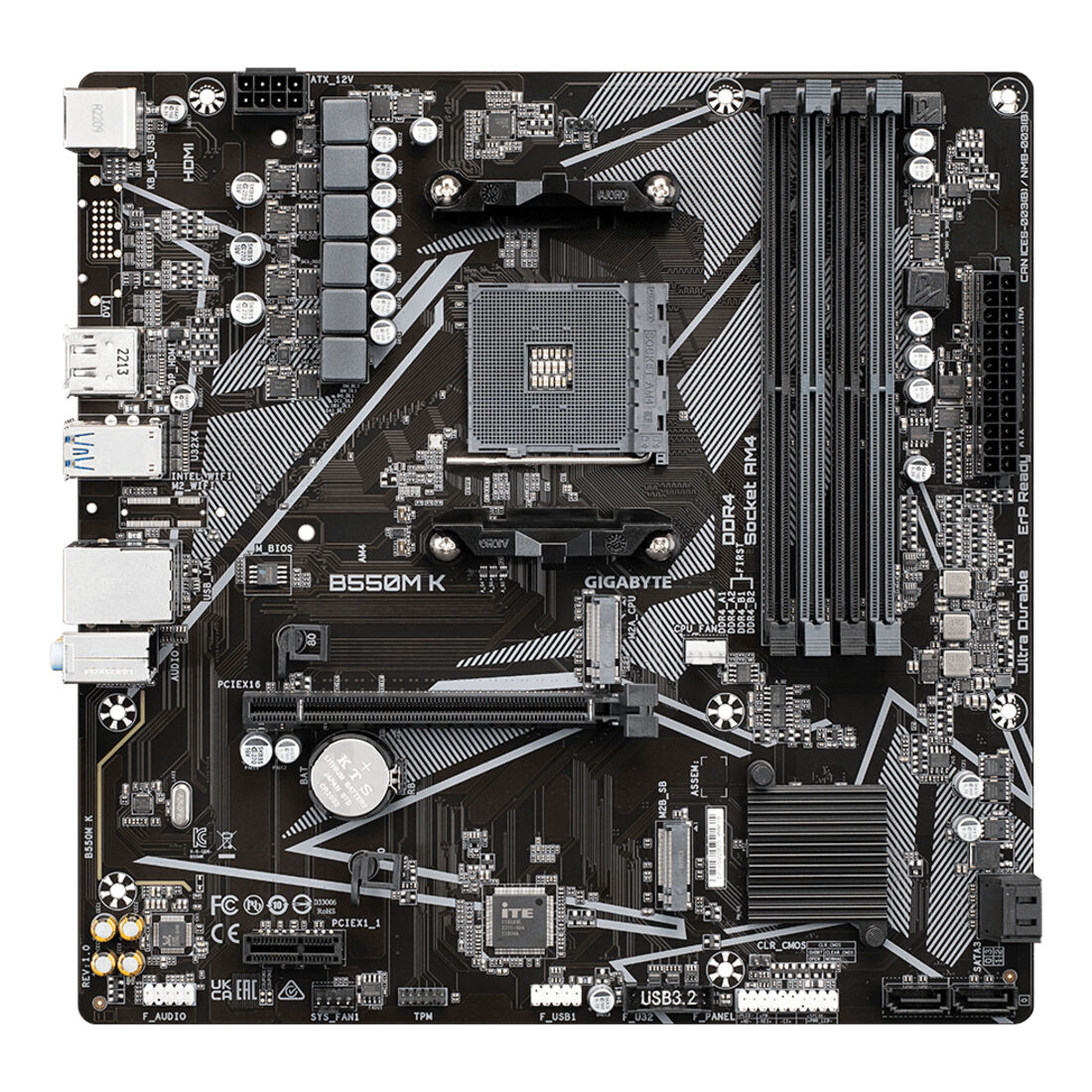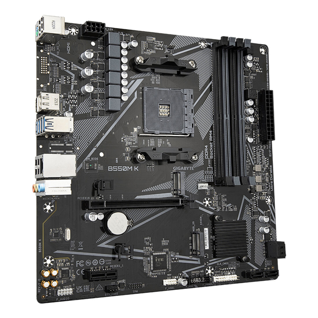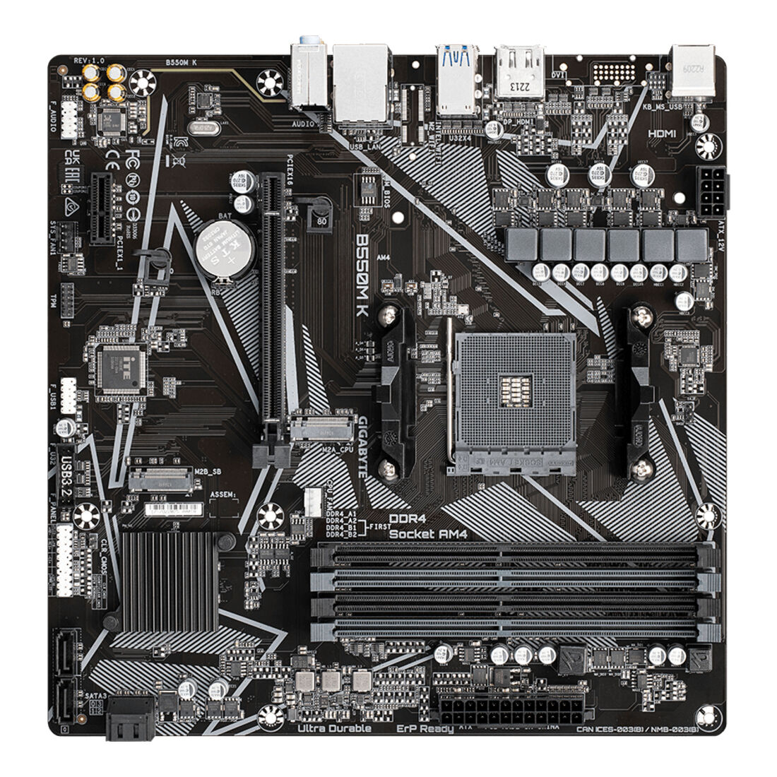 GIGABYTE B550M K Scheda madre – CPU AMD Ryzen 5000, fino a 4733 MHz DDR4, 1xPCIe 4.0 + 1xPCIe 3.0 M.2, LAN 1GbE, USB 3.2 Gen 1. Produttore processore: AMD, Presa per processore: Socket AM4, Processori compatibili: AMD Ryzen 3000 Series, AMD Ryzen 4000 Series, AMD Ryzen 5000 Series. Tipi di memoria supportati: DDR4-SDRAM, RAM massima supportata: 128 GB, tipo di slot di memoria: DIMM. Interfacce dell’unità di archiviazione supportate: M.2, SATA, Tipi di unità di archiviazione supportate: HDD & SSD, Livelli RAID: 0, 1, 10. Risoluzione massima: 5120 x 2880 Pixel. Tipo di interfaccia Ethernet: Gigabit Ethernet, Controller LAN: Realtek RTL8111H