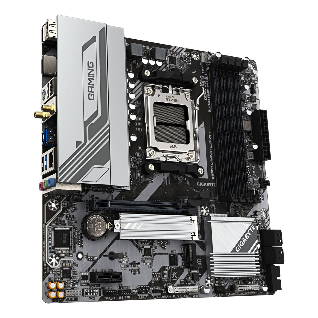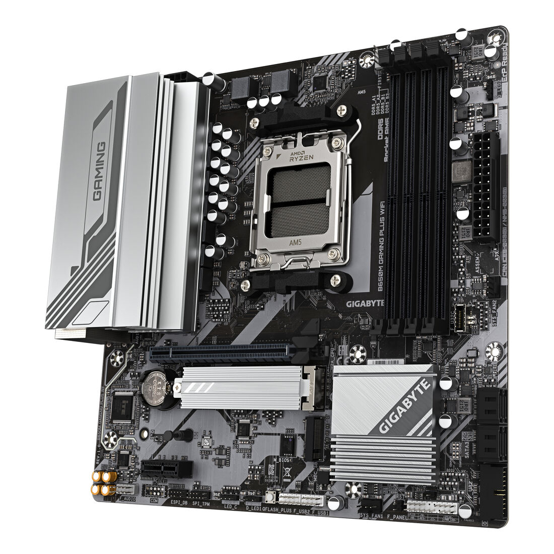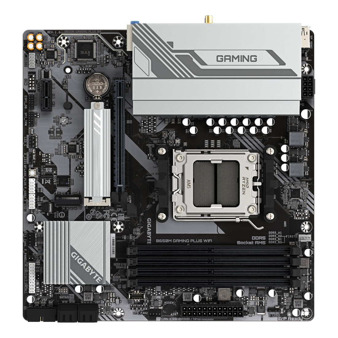 GIGABYTE B650M GAMING PLUS WIFI Scheda madre – CPU AMD Ryzen 9000, VRM a 5+2+2 fasi, fino a 8000 MHz DDR5, 2xPCIe 4.0 M.2, LAN 2.5GbE, WIFI 6E, USB 3.2 Gen 1. Produttore processore: AMD, Presa per processore: Socket AM5, Processori compatibili: AMD Ryzen 7000 Series, AMD Ryzen 8000 Series, AMD Ryzen 9000 Series. Tipi di memoria supportati: DDR5-SDRAM, RAM massima supportata: 256 GB, tipo di slot di memoria: DIMM. Interfacce dell’unità di archiviazione supportate: M.2, PCI Express 4.0, SATA III, Tipi di unità di archiviazione supportate: HDD & SSD, Livelli RAID: 0, 1, 10. Risoluzione massima: 4096 x 2160 Pixel. Tipo di interfaccia Ethernet: 2.5 Gigabit Ethernet, Controller LAN: Realtek RTL8125, Wi-Fi standard: Wi-Fi 6E (802.11ax)