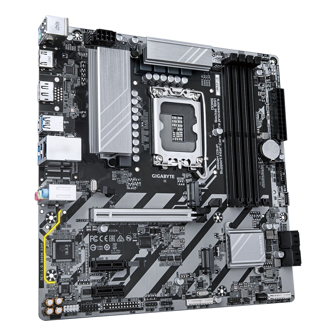 GIGABYTE B860M D3HP Scheda madre – CPU Intel Core Ultra, VRM a 4+1+2+1 fasi, fino a 9066MHz DDR5, 2xPCIe 4.0 M.2, LAN GbE, USB 3.2 Gen 1. Produttore processore: Intel, Presa per processore: LGA 1851 (Socket V1), Processori compatibili: Intel Core Ultra (Serie 1), Intel Core Ultra (Series 2). Tipi di memoria supportati: DDR5-SDRAM, RAM massima supportata: 256 GB, tipo di slot di memoria: DIMM. Interfacce dell’unità di archiviazione supportate: M.2, SATA III, Tipi di unità di archiviazione supportate: HDD & SSD, Livelli RAID: 0, 1, 5, 10. Risoluzione massima: 4096 x 2160 Pixel. Tipo di interfaccia Ethernet: Gigabit Ethernet, Controller LAN: Realtek RTL8111H
