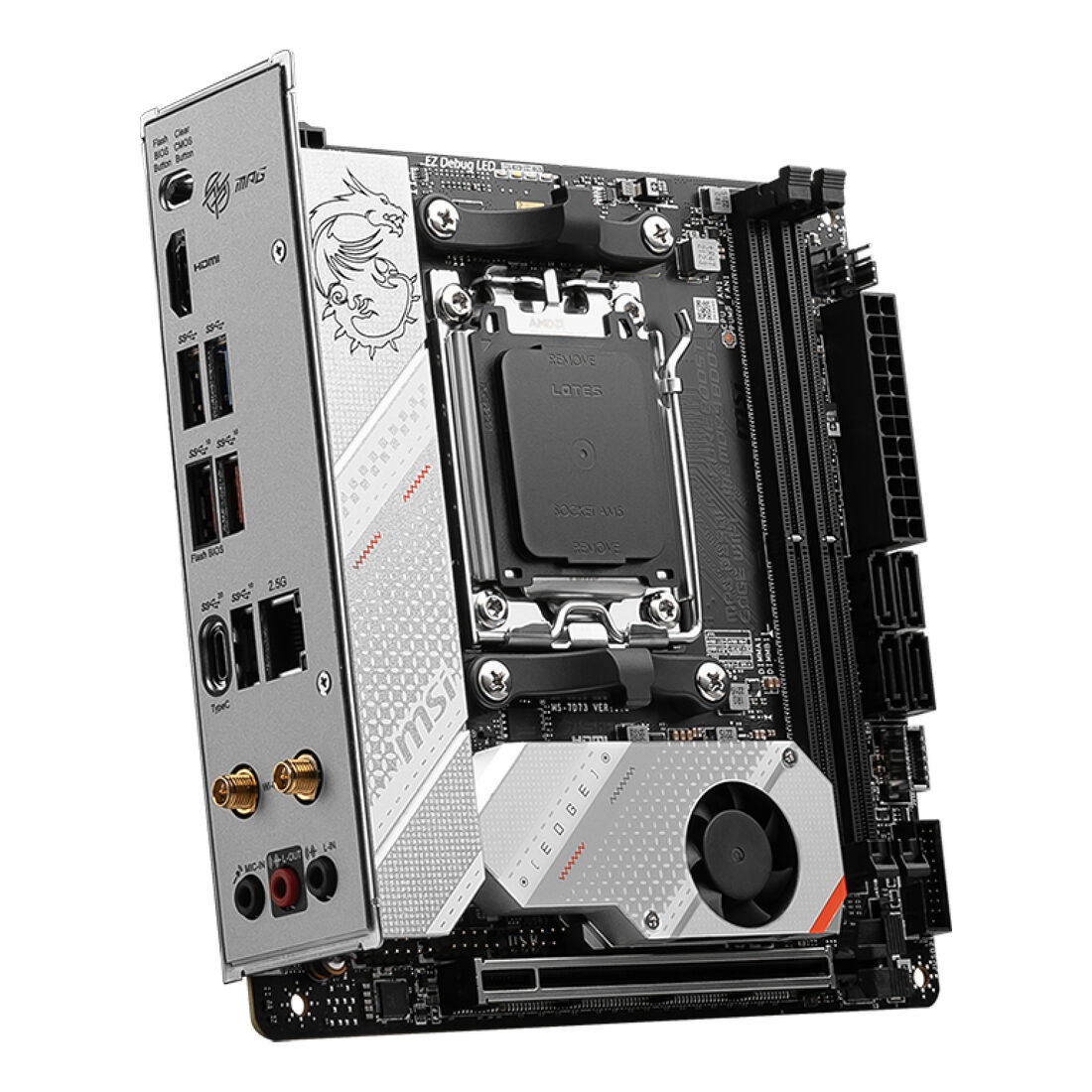 MSI MPG B650I EDGE WIFI. Produttore processore: AMD, Presa per processore: Socket AM5, Processori compatibili: AMD Ryzen 7000 Series. Tipi di memoria supportati: DDR5-SDRAM, RAM massima supportata: 64 GB, Compatibilità ECC: Non-ECC. Interfacce dell’unità di archiviazione supportate: M.2, SATA, Livelli RAID: 0, 1, 10. Tipo di interfaccia Ethernet: 2.5 Gigabit Ethernet, Controller LAN: Realtek RTL8125B, Wi-Fi standard: Wi-Fi 6E (802.11ax). Componente per: PC, Fattore di forma scheda madre: mini ATX, Famiglia di chipset per scheda madre: AMD