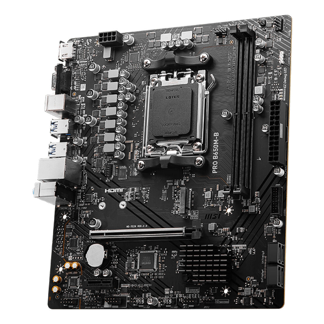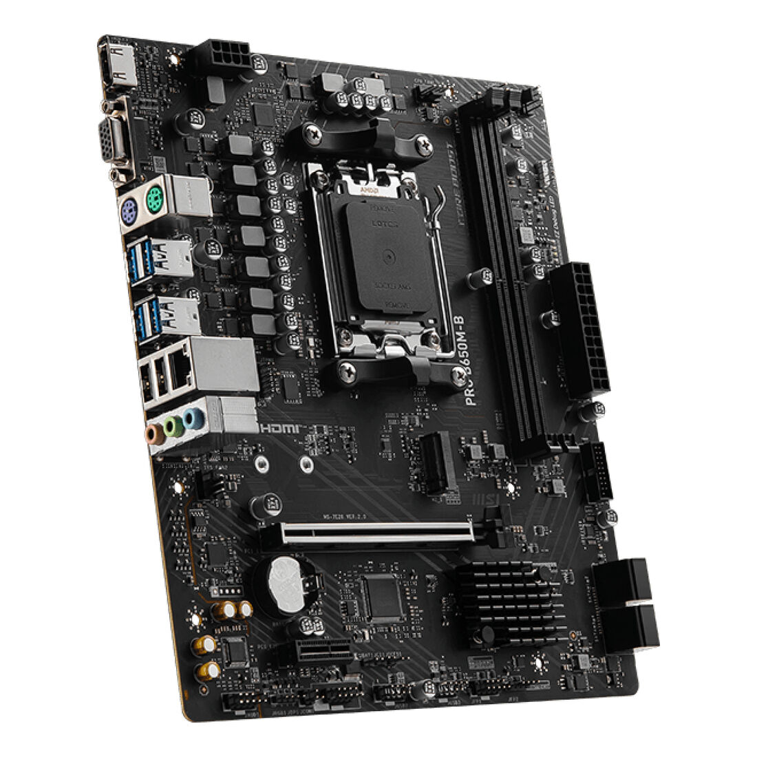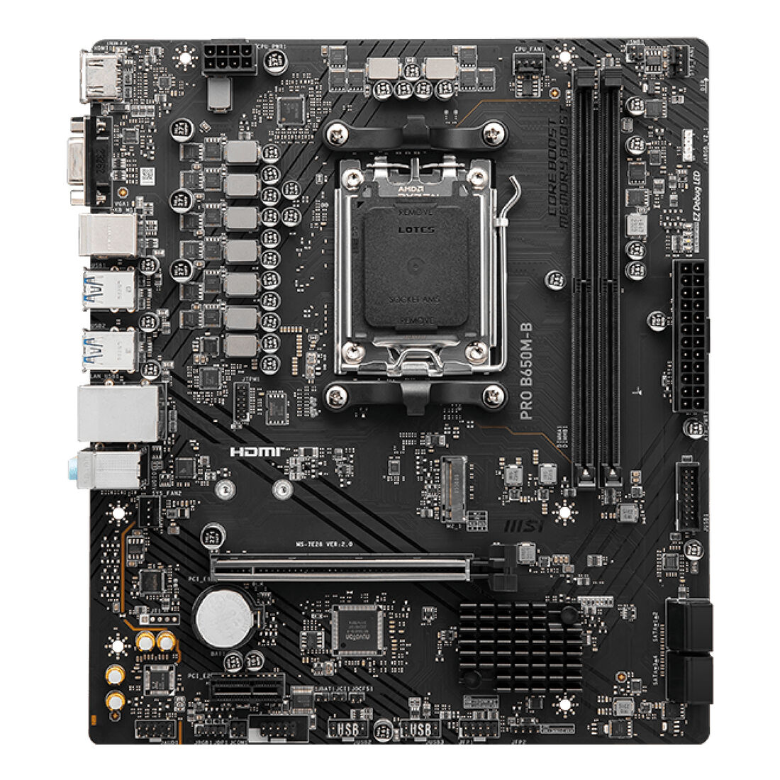 MSI PRO B650M-B. Produttore processore: AMD, Presa per processore: Socket AM5, Processori compatibili: AMD Ryzen 7000 Series. Tipi di memoria supportati: DDR5-SDRAM, RAM massima supportata: 96 GB, Velocità di memoria supportate: 6800, 6600, 6400, 6200, 6000, 5800, 5600, 5400, 5200, 5000, 4800 MHz. Interfacce dell’unità di archiviazione supportate: M.2, SATA, Livelli RAID: 0, 1, 10. Tipo di interfaccia Ethernet: 2.5 Gigabit Ethernet, Controller LAN: Realtek RTL8125-BG. Componente per: PC, Fattore di forma scheda madre: micro ATX, Famiglia di chipset per scheda madre: AMD
