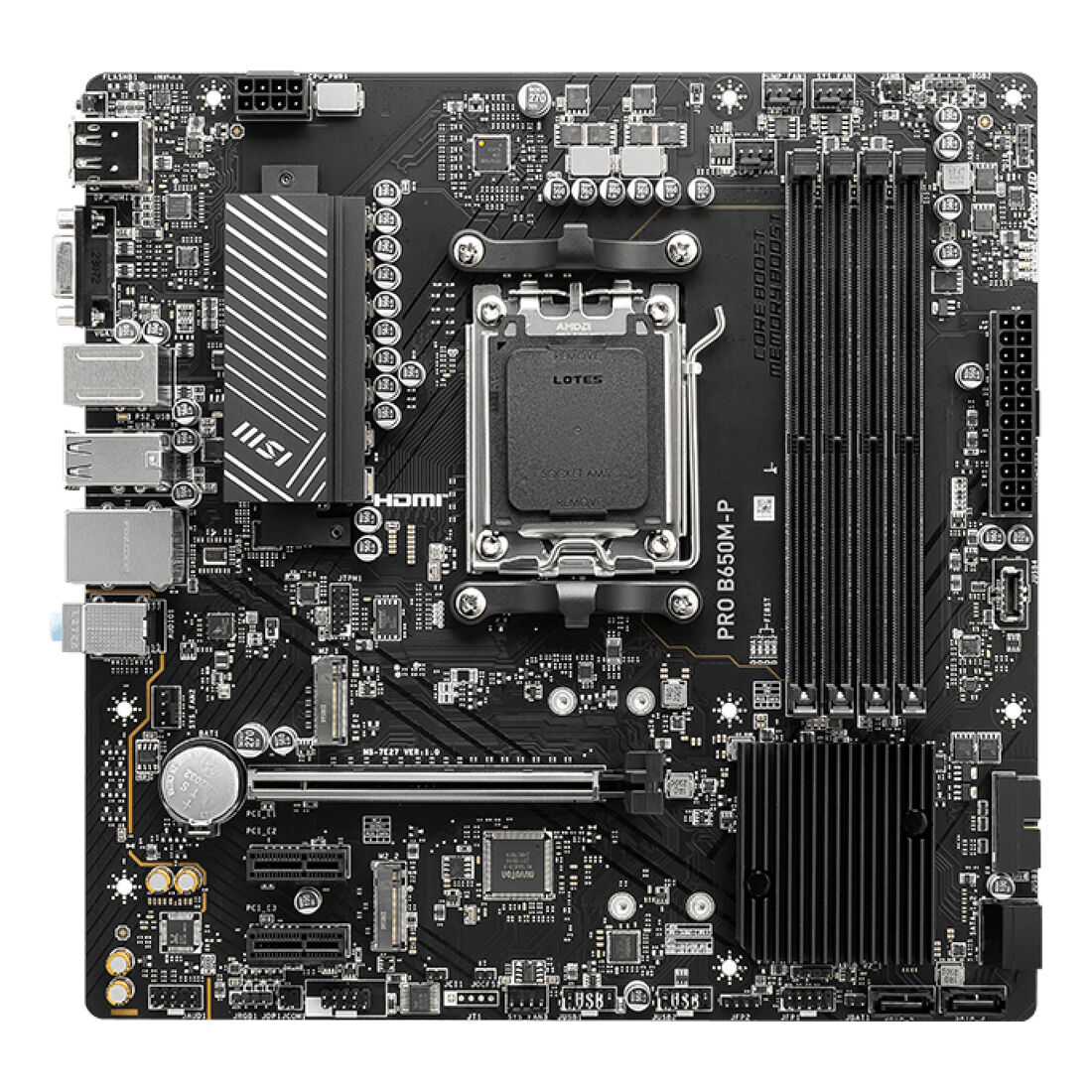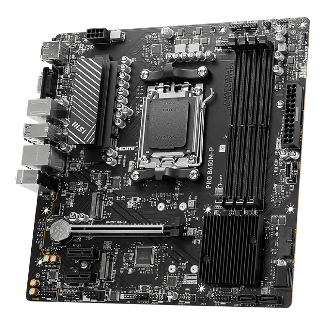 MSI PRO B650M-P. Produttore processore: AMD, Presa per processore: Socket AM5, Processori compatibili: AMD Ryzen 7000 Series. Tipi di memoria supportati: DDR5-SDRAM, RAM massima supportata: 192 GB, Compatibilità ECC: Non-ECC. Interfacce dell’unità di archiviazione supportate: M.2, SATA, Livelli RAID: 0, 1, 10. Tipo di interfaccia Ethernet: 2.5 Gigabit Ethernet, Controller LAN: Realtek RTL8125-BG. Componente per: PC, Fattore di forma scheda madre: micro ATX, Famiglia di chipset per scheda madre: AMD