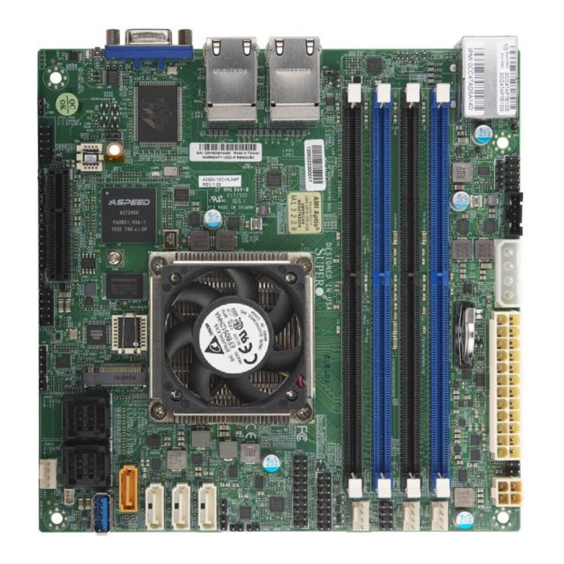 Supermicro A2SDI-8C+-HLN4F. Produttore processore: Intel, Processori compatibili: Intel Atom®, Potenza termica del processore (max): 25 W. Tipi di memoria supportati: DDR4-SDRAM, tipo di slot di memoria: DIMM, Voltaggio della memoria: 1.2 V. Tipo di interfaccia Ethernet: Gigabit Ethernet. Componente per: PC, Fattore di forma scheda madre: mini ITX, Famiglia di chipset per scheda madre: Intel. Tipo BIOS: UEFI AMI