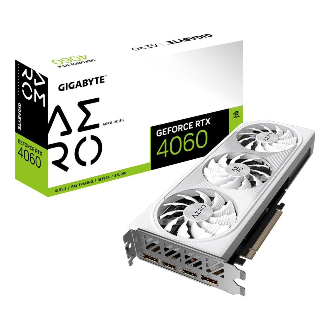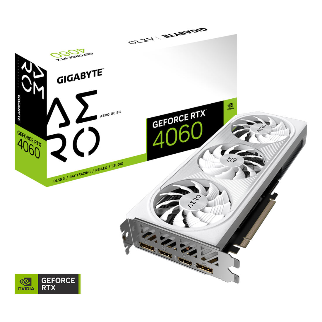 GIGABYTE AERO GeForce RTX 4060 OC 8G. Processore grafico / fornitore: NVIDIA, Processore grafico: GeForce RTX 4060, Frequenza del processore: 2550 MHz. Memoria Grafica Dedicata: 8 GB, Tipo memoria adattatore grafico: GDDR6, Ampiezza dati: 128 bit. Risoluzione massima: 7680 x 4320 Pixel. Versione DirectX: 12 Ultimate, Versione OpenGL: 4.6. Tipo interfaccia: PCI Express 4.0. Tipo di raffreddamento: Attivo, Numero di ventole: 3 ventola(e)