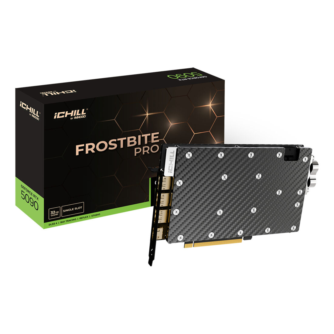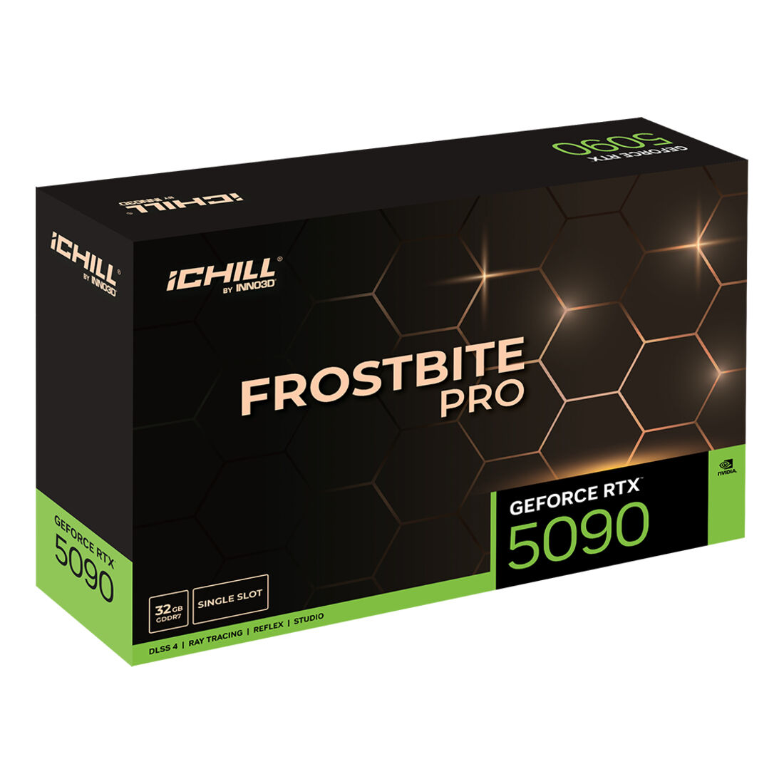 INNO3D iChill GeForce RTX 5090 Frostbite Pro. Processore grafico / fornitore: NVIDIA, Processore grafico: GeForce RTX 5090, Frequenza del processore: 2017 MHz. Memoria Grafica Dedicata: 32 GB, Tipo memoria adattatore grafico: GDDR7, Ampiezza dati: 512 bit. Risoluzione massima: 7680 x 4320 Pixel. Versione DirectX: 12 Ultimate, Versione OpenGL: 4.6. Tipo interfaccia: PCI Express 5.0. Tipo di raffreddamento: Liquido