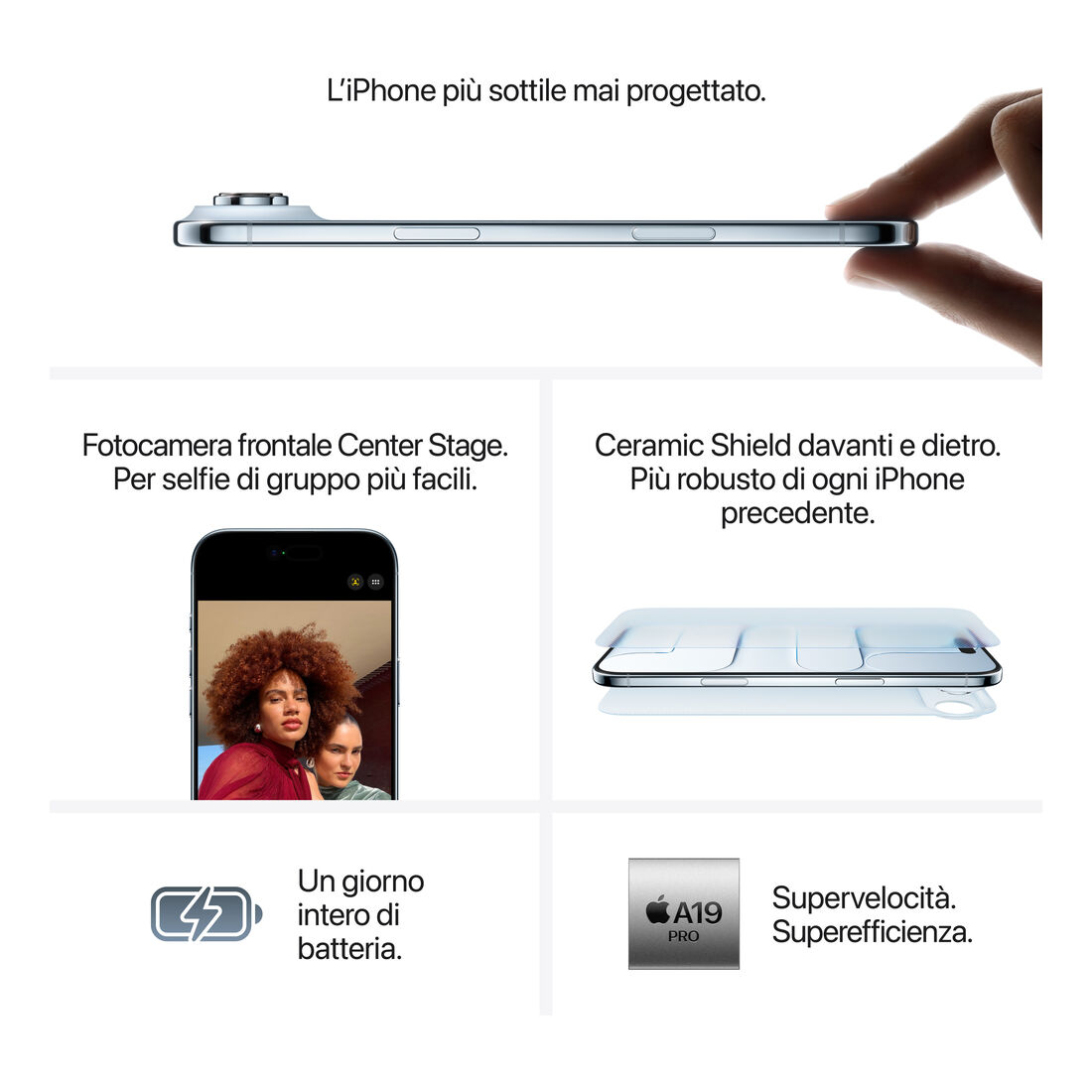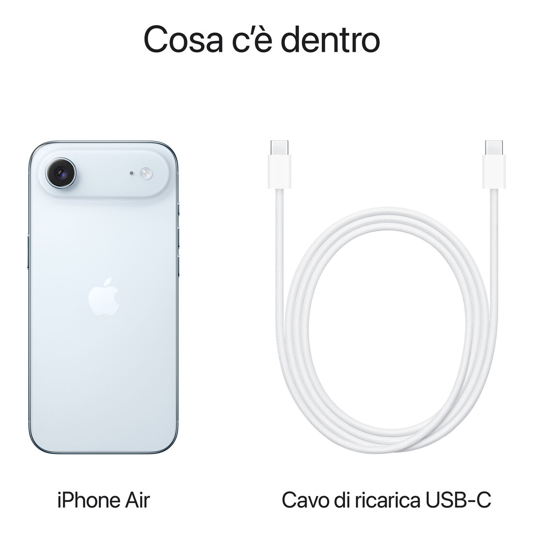 Apple iPhone Air 1TB Celeste. Dimensioni diagonale schermo: 16,5 cm (6.5″), Risoluzione del display: 2736 x 1260 Pixel. Famiglia processore: Apple, Modello del processore: A19 Pro. Capacità memoria interna: 1 TB. Risoluzione fotocamera posteriore (numerico): 48 MP, Tipo di fotocamera posteriore: Fotocamera singola. Capacità della scheda SIM: Doppia SIM. Sistema operativo incluso: iOS 26. Colore del prodotto: Blu. Peso: 165 g
