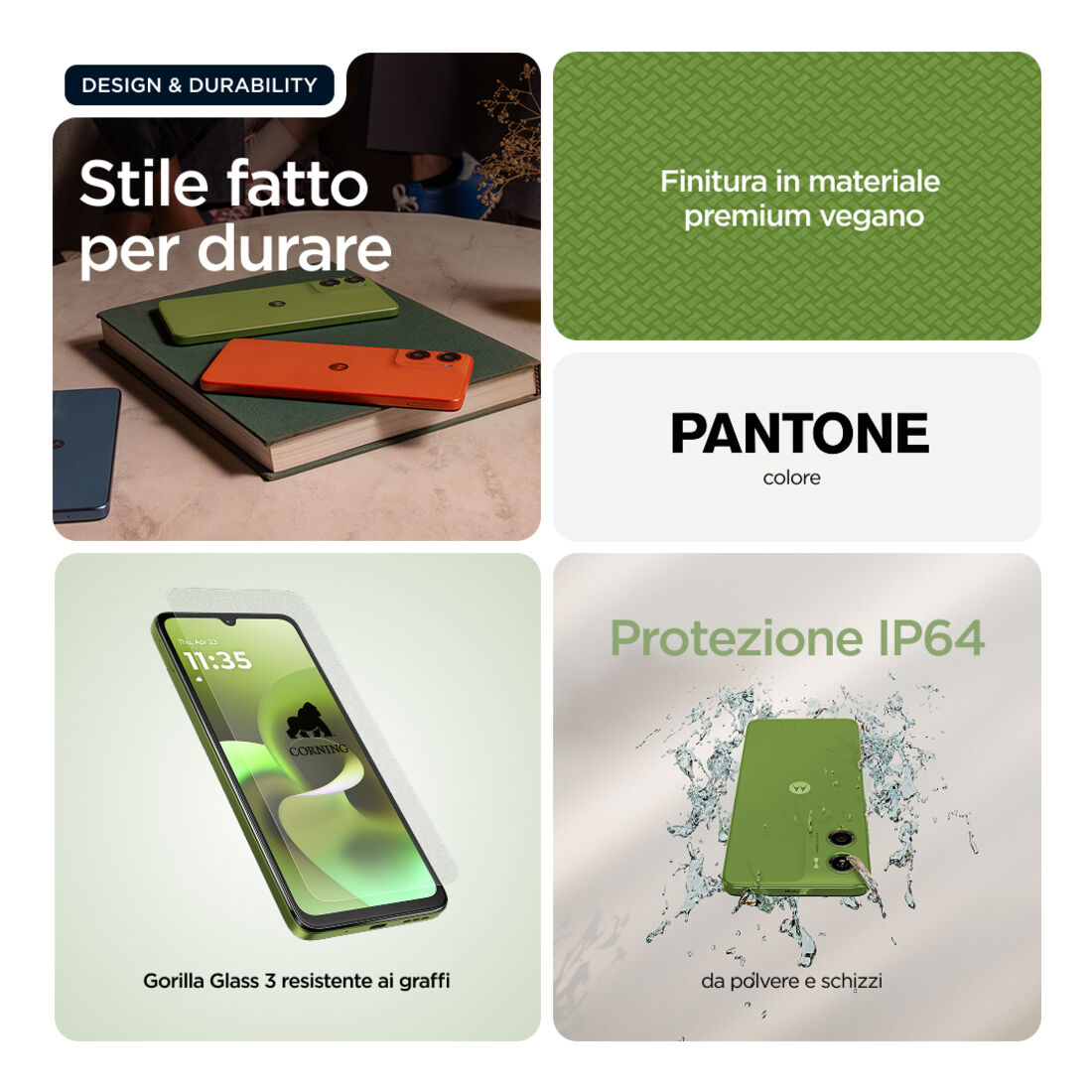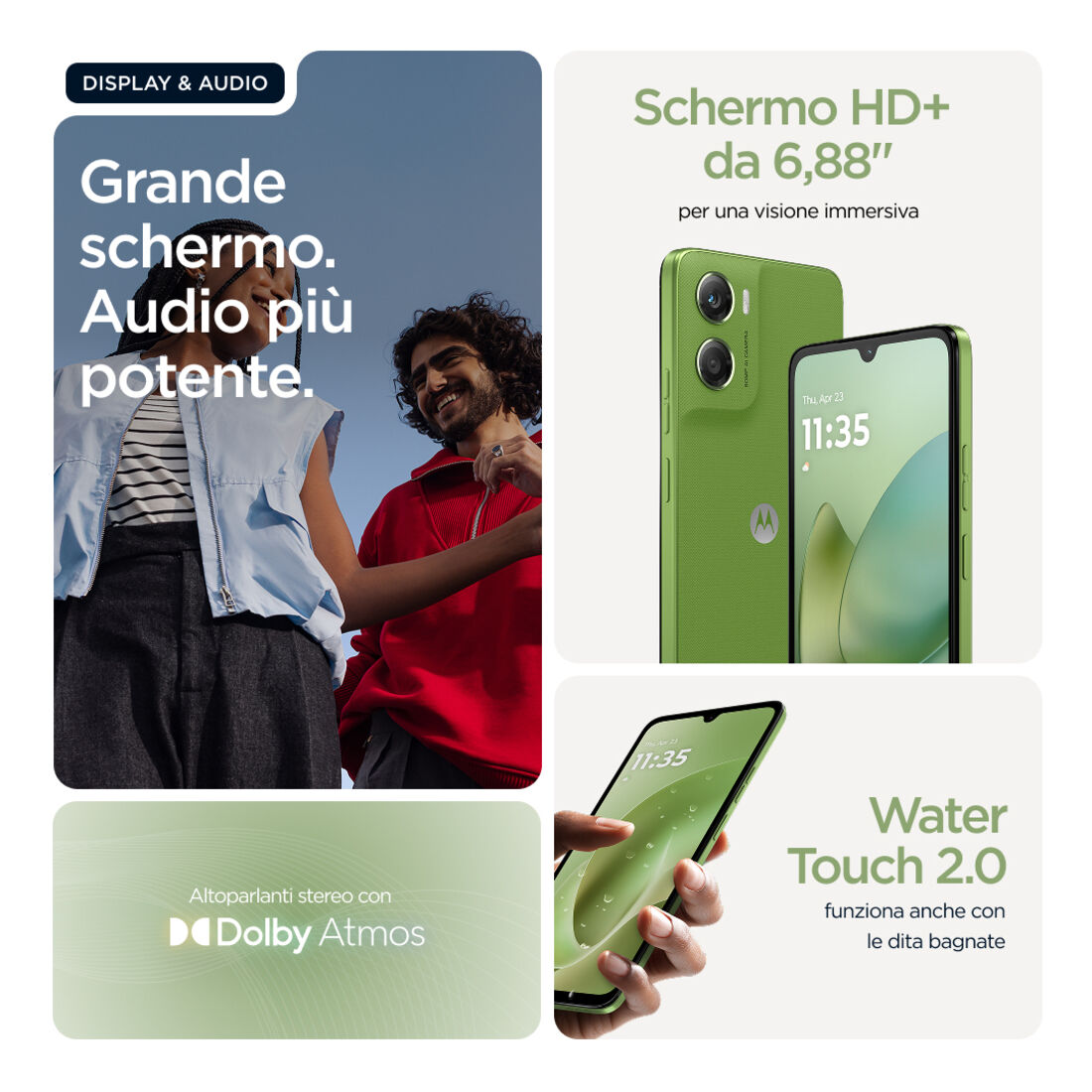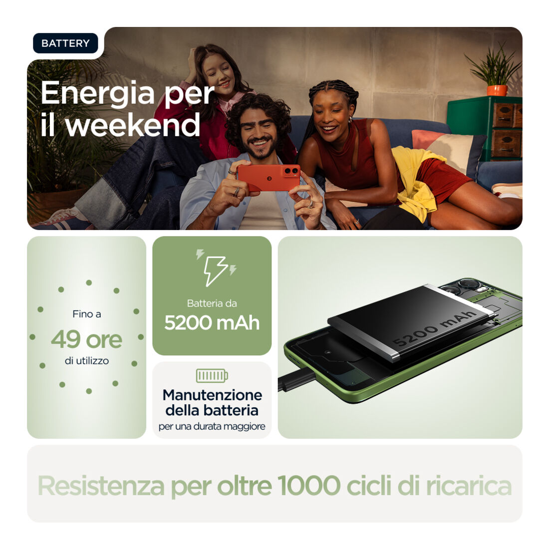 Motorola moto g06 . Dimensioni diagonale schermo: 17,5 cm (6.88″), Risoluzione del display: 1640 x 720 Pixel. Frequenza del processore: 1,7 GHz, Famiglia processore: MediaTek, Modello del processore: Helio G81 Extreme. Capacità della RAM: 4 GB, Tipo di RAM: LPDDR4X, Capacità memoria interna: 128 GB. Risoluzione fotocamera posteriore (numerico): 50 MP, Tipo di fotocamera posteriore: Fotocamera singola. Capacità della scheda SIM: Doppia SIM. Sistema operativo incluso: Android 15. Capacità della batteria: 5200 mAh. Colore del prodotto: Verde. Peso: 194 g