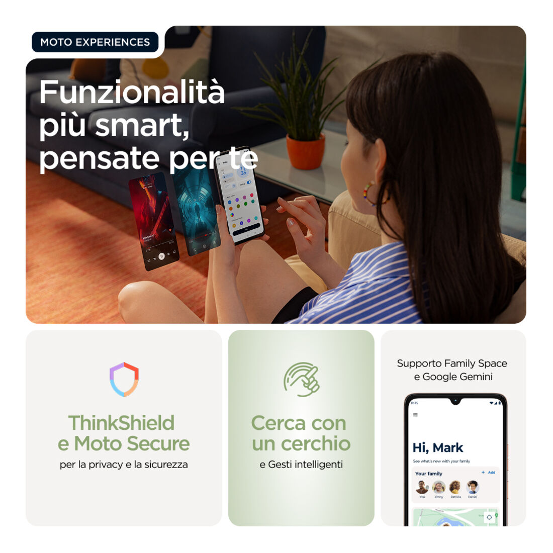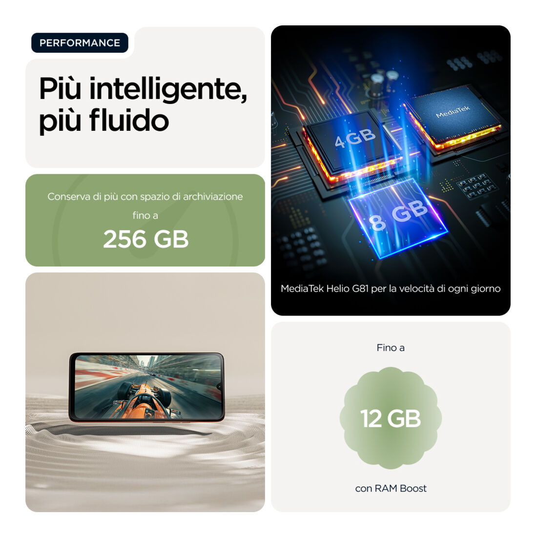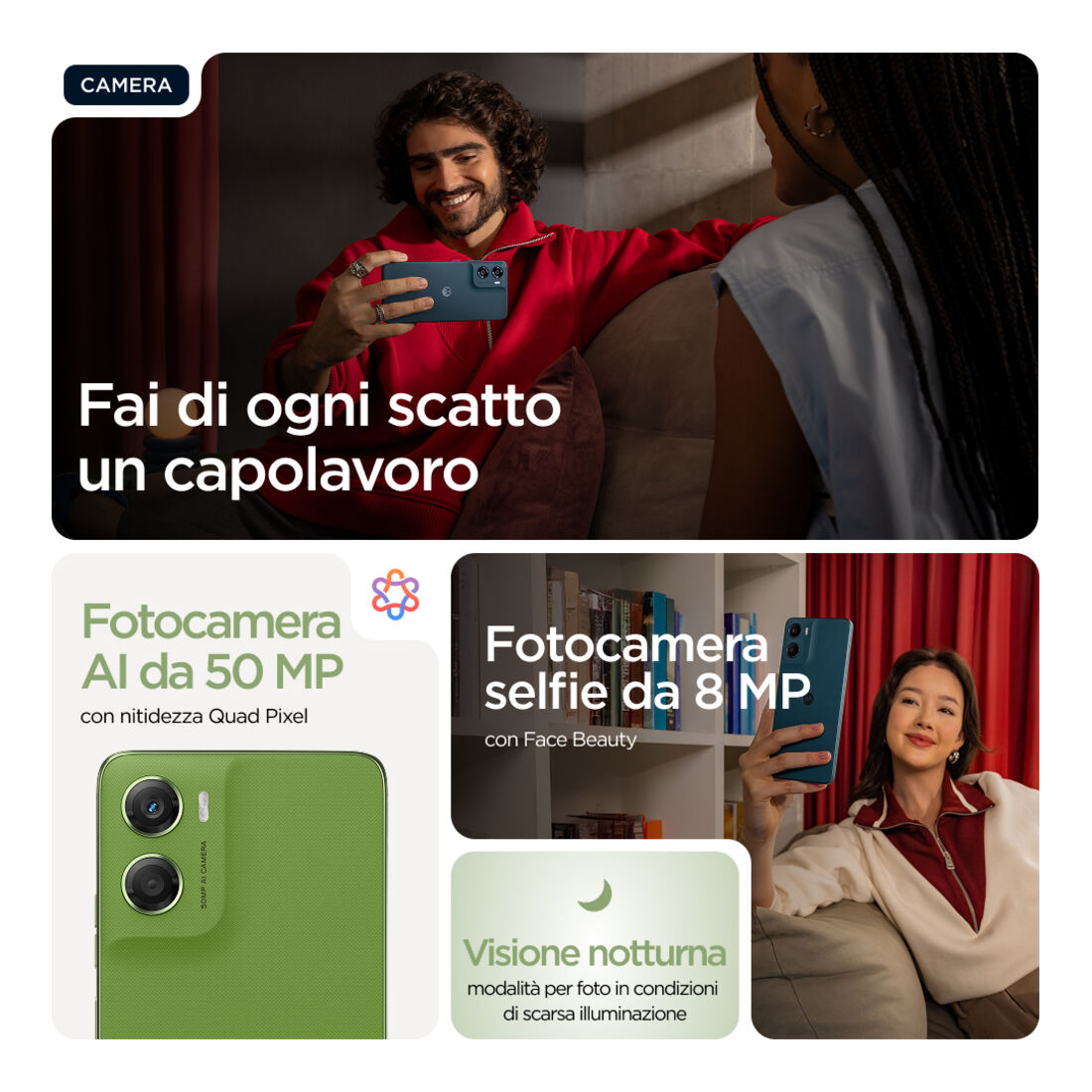 Motorola moto g06 . Dimensioni diagonale schermo: 17,5 cm (6.88″), Risoluzione del display: 1640 x 720 Pixel. Frequenza del processore: 1,7 GHz, Famiglia processore: MediaTek, Modello del processore: Helio G81 Extreme. Capacità della RAM: 4 GB, Tipo di RAM: LPDDR4X, Capacità memoria interna: 128 GB. Risoluzione fotocamera posteriore (numerico): 50 MP, Tipo di fotocamera posteriore: Fotocamera singola. Capacità della scheda SIM: Doppia SIM. Sistema operativo incluso: Android 15. Capacità della batteria: 5200 mAh. Colore del prodotto: Verde. Peso: 194 g