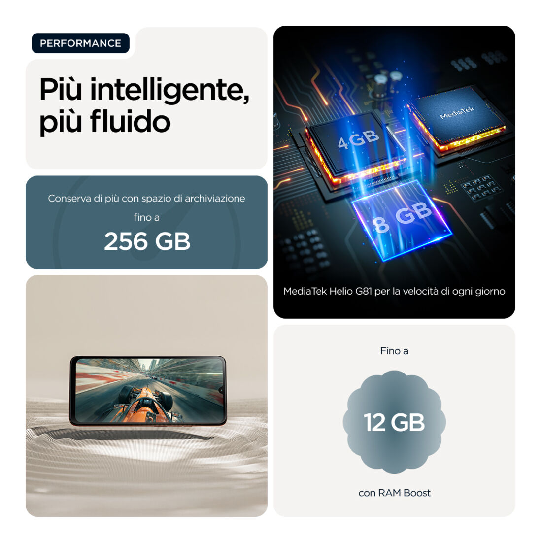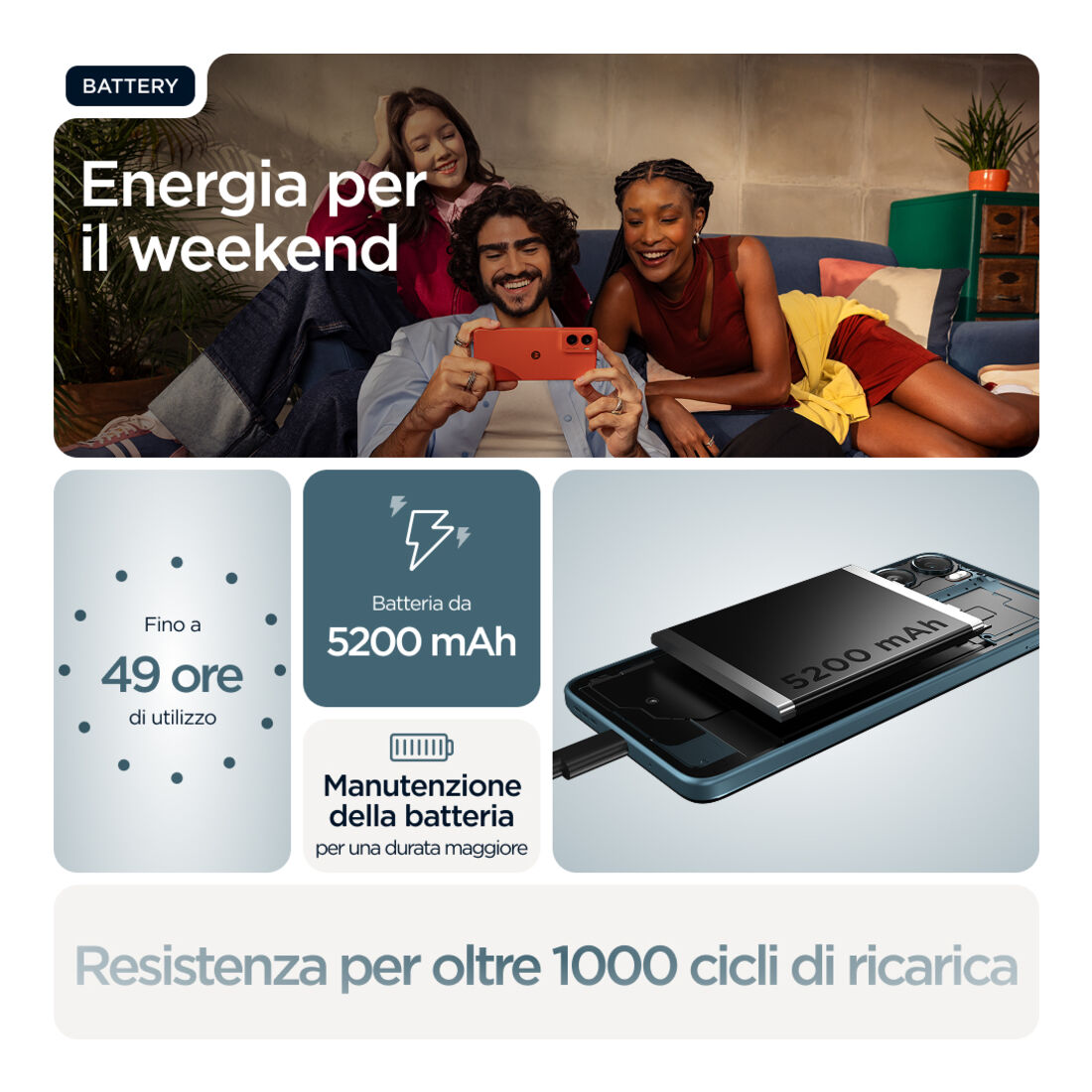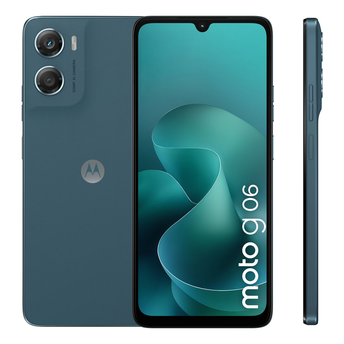 Motorola moto g06 . Dimensioni diagonale schermo: 17,5 cm (6.88″), Risoluzione del display: 1640 x 720 Pixel. Frequenza del processore: 1,7 GHz, Famiglia processore: MediaTek, Modello del processore: Helio G81 Extreme. Capacità della RAM: 4 GB, Tipo di RAM: LPDDR4X, Capacità memoria interna: 256 GB. Risoluzione fotocamera posteriore (numerico): 50 MP, Tipo di fotocamera posteriore: Fotocamera singola. Capacità della scheda SIM: Doppia SIM. Sistema operativo incluso: Android 15. Capacità della batteria: 5200 mAh. Colore del prodotto: Blu. Peso: 194 g