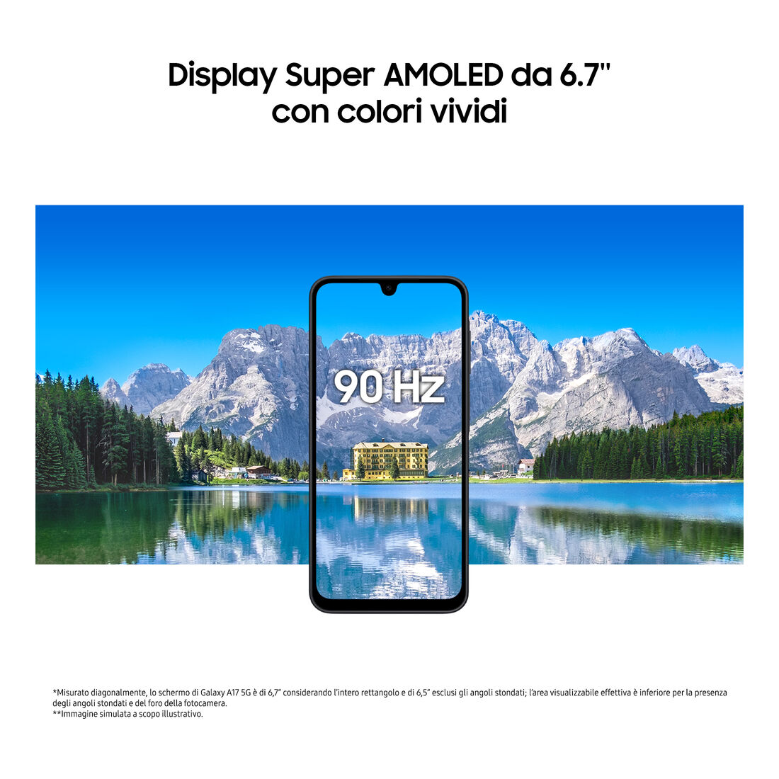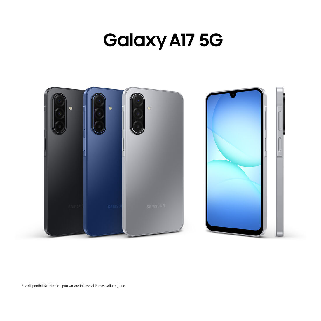 Samsung Galaxy A17 5G, Android 15, Display sAMOLED 6.7″, 8GB RAM, 256GB, Batteria 5.000 mAh, Resistenza IP54, Memoria espandibile fino a 2TB, Black. Dimensioni diagonale schermo: 17 cm (6.7″), Risoluzione del display: 1080 x 2340 Pixel. Capacità della RAM: 8 GB, Capacità memoria interna: 256 GB. Risoluzione fotocamera posteriore (numerico): 50 MP, Tipo di fotocamera posteriore: Tripla fotocamera. Capacità della scheda SIM: Dual SIM ibrida. Capacità della batteria: 5000 mAh. Colore del prodotto: Nero. Peso: 192 g
