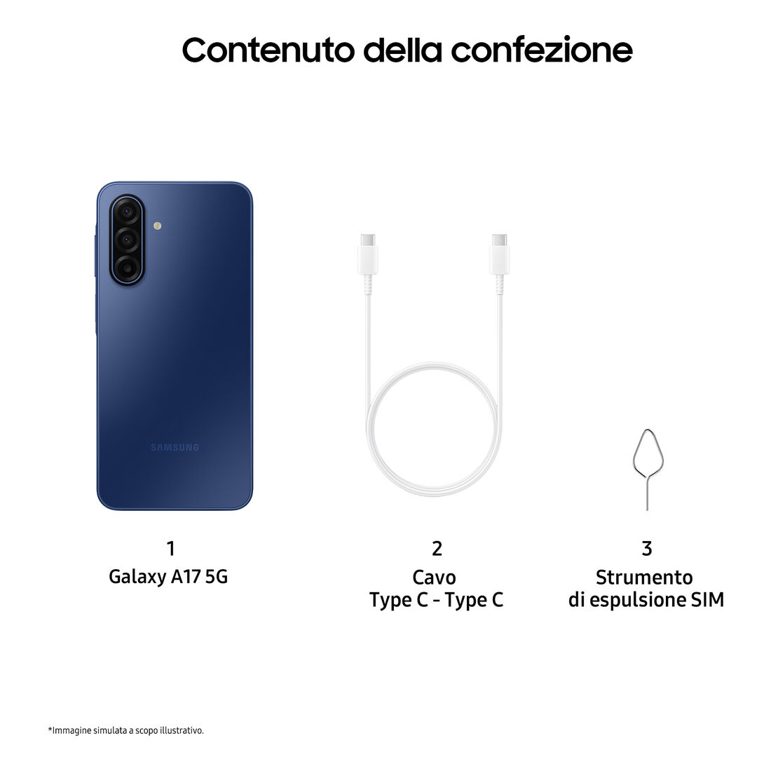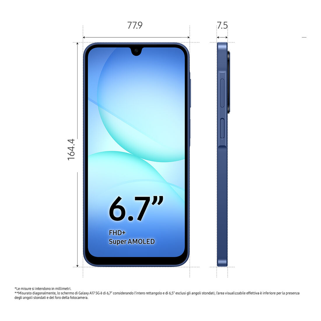 Samsung Galaxy A17 5G, Android 15, Display sAMOLED 6.7″, 8GB RAM, 256GB, Batteria 5.000 mAh, Resistenza IP54, Memoria espandibile fino a 2TB, Blue. Dimensioni diagonale schermo: 17 cm (6.7″), Risoluzione del display: 1080 x 2340 Pixel. Capacità della RAM: 8 GB, Capacità memoria interna: 256 GB. Risoluzione fotocamera posteriore (numerico): 50 MP, Tipo di fotocamera posteriore: Tripla fotocamera. Capacità della scheda SIM: Dual SIM ibrida. Capacità della batteria: 5000 mAh. Colore del prodotto: Blu. Peso: 192 g