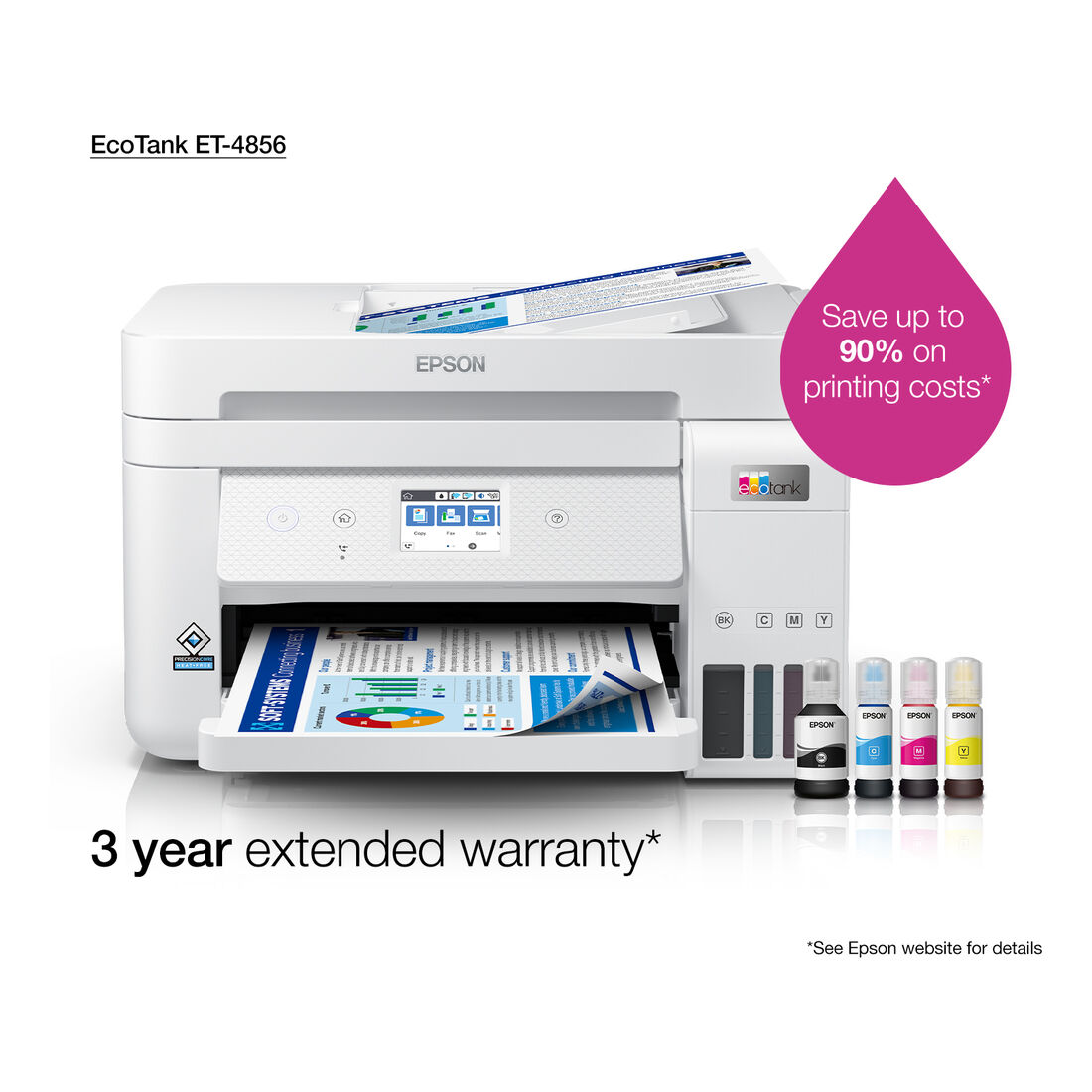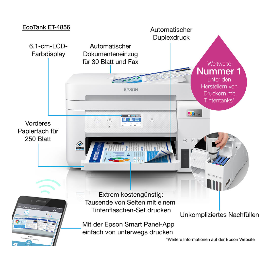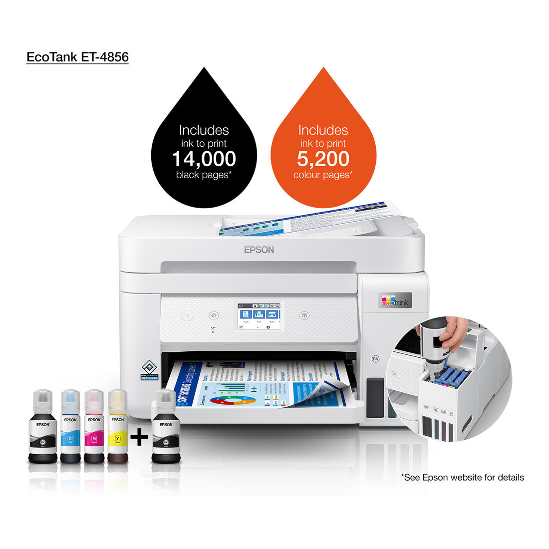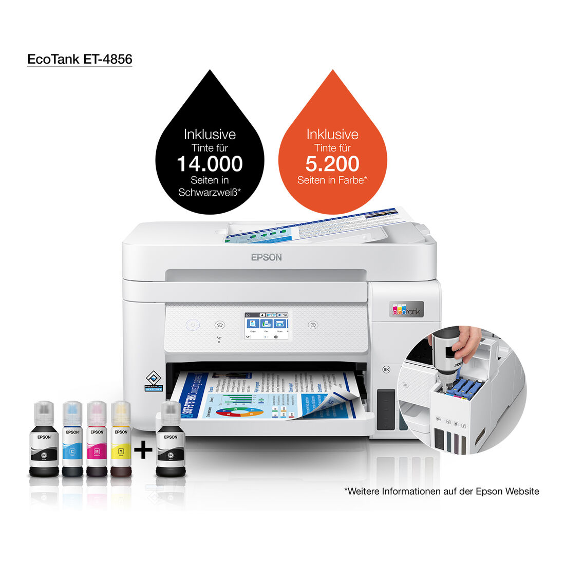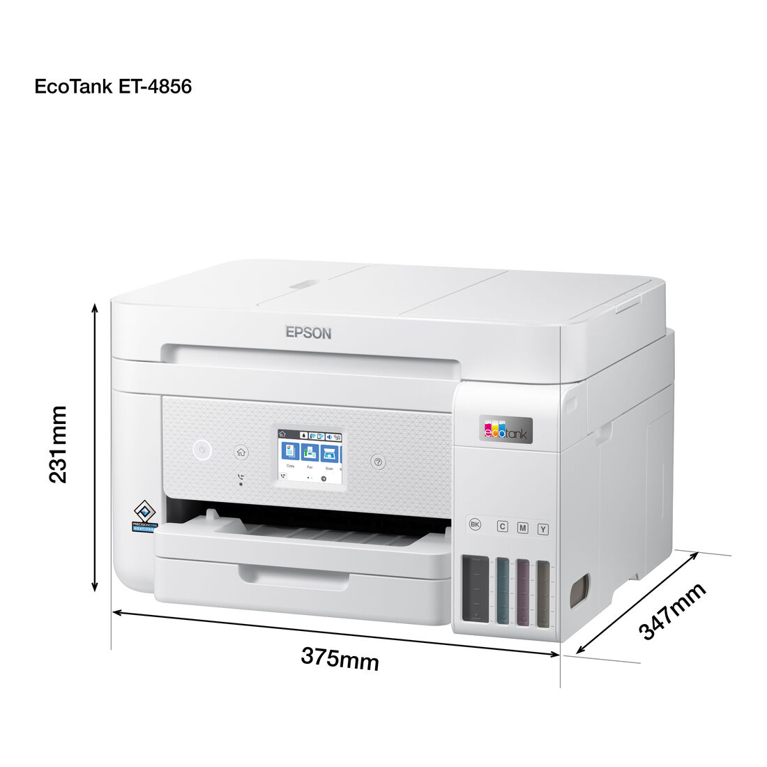 Epson EcoTank ET-4856. Tecnologia di stampa: Ad inchiostro, Stampa: Stampa a colori, Risoluzione massima: 4800 x 1200 DPI, Velocità di stampa (colore, qualità normale, A4/US Letter): 20 ppm. Copia: Copia a colori. Scansione: Scansione a colori, Risoluzione di scansione ottica: 1200 x 2400 DPI. Funzione duplex: Stampa. Massimo formato carta serie ISO A: A4. Wi-Fi. Stampa diretta. Colore del prodotto: Bianco