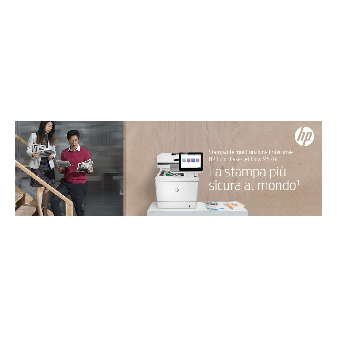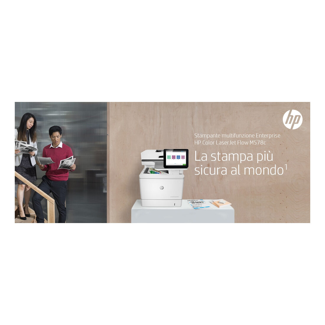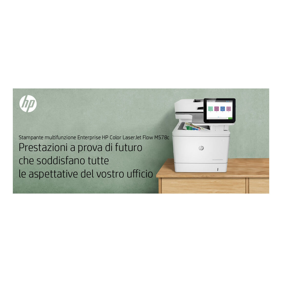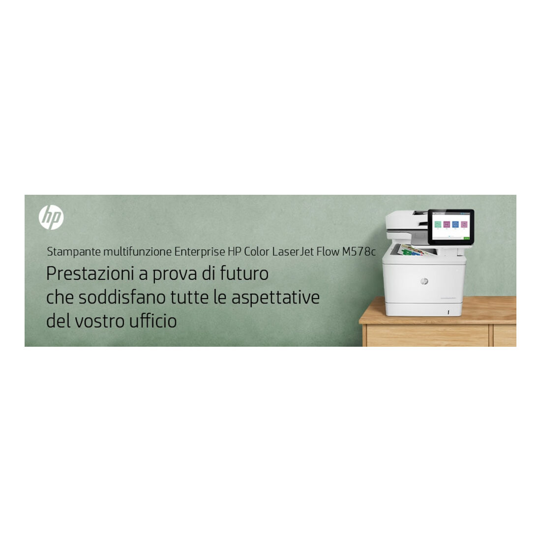 HP Color LaserJet Enterprise Flow Stampante multifunzione Enterprise Color LaserJet Flow M578c, Stampa, copia, scansione, fax, Stampa fronte/retro; ADF da 100 fogli; efficienza energetica. Tecnologia di stampa: Laser, Stampa: Stampa a colori, Risoluzione massima: 1200 x 1200 DPI, Velocità di stampa (colore, qualità normale, A4/US Letter): 38 ppm. Copia: Copia a colori, Risoluzione di copia massima: 600 x 600 DPI. Scansione: Scansione a colori, Risoluzione di scansione ottica: 600 x 600 DPI. Fax: Fax a colori. Funzione duplex: Stampa, Copia, Scansione. Massimo formato carta serie ISO A: A4. Stampa diretta. Colore del prodotto: Grigio