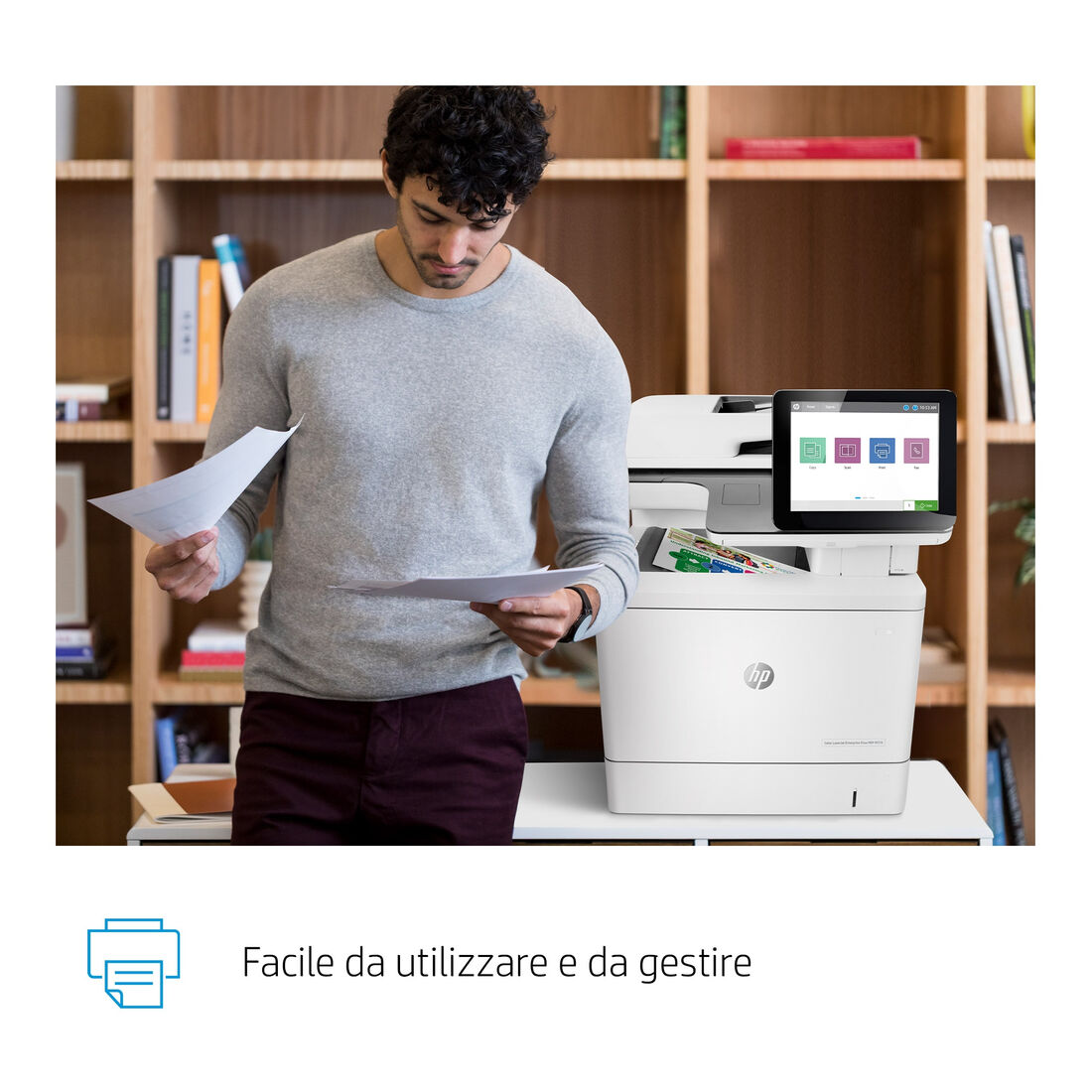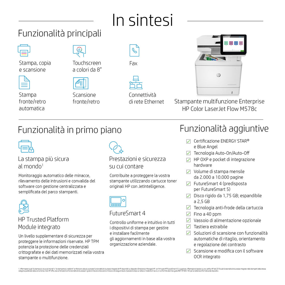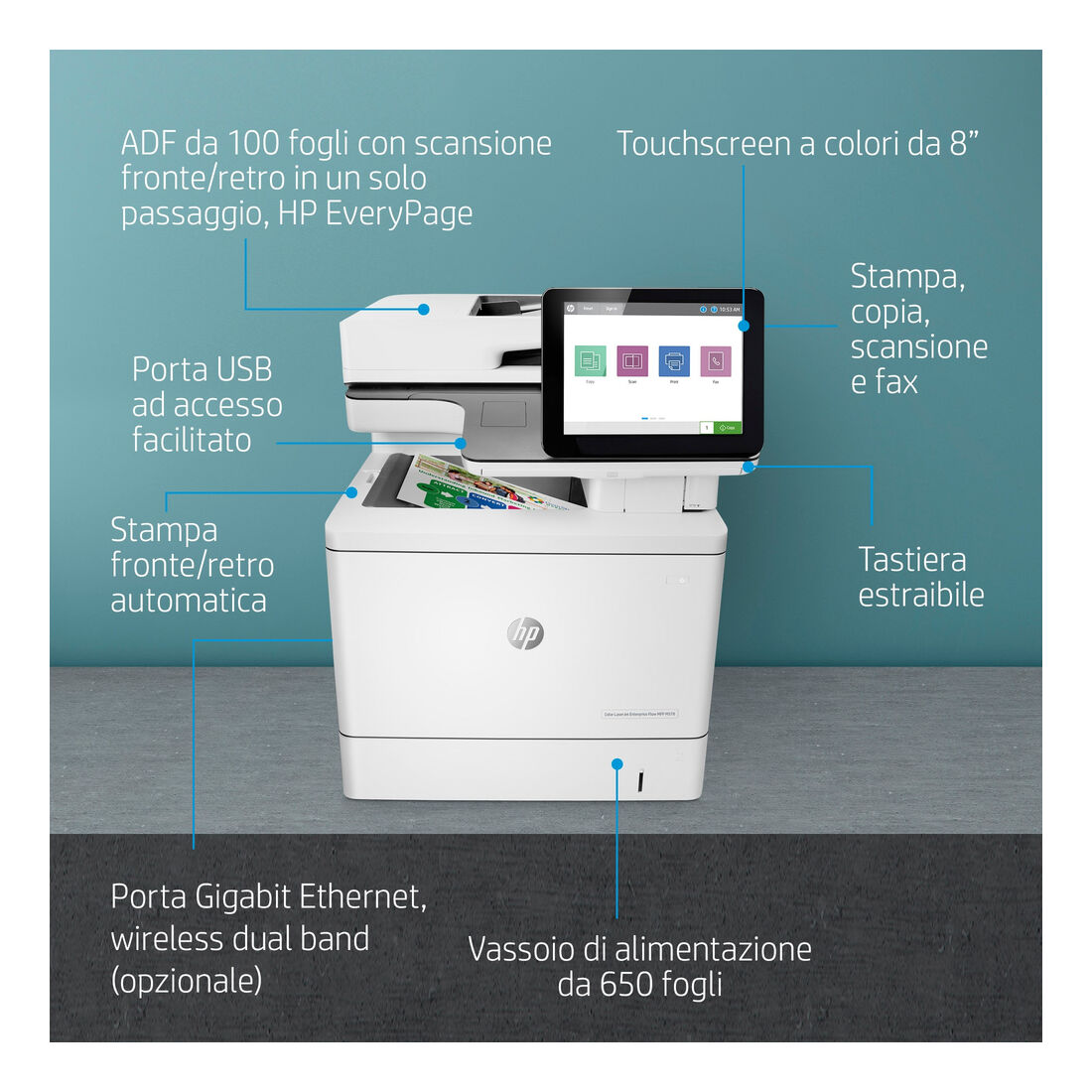 HP Color LaserJet Enterprise Flow Stampante multifunzione Enterprise Color LaserJet Flow M578c, Stampa, copia, scansione, fax, Stampa fronte/retro; ADF da 100 fogli; efficienza energetica. Tecnologia di stampa: Laser, Stampa: Stampa a colori, Risoluzione massima: 1200 x 1200 DPI, Velocità di stampa (colore, qualità normale, A4/US Letter): 38 ppm. Copia: Copia a colori, Risoluzione di copia massima: 600 x 600 DPI. Scansione: Scansione a colori, Risoluzione di scansione ottica: 600 x 600 DPI. Fax: Fax a colori. Funzione duplex: Stampa, Copia, Scansione. Massimo formato carta serie ISO A: A4. Stampa diretta. Colore del prodotto: Grigio