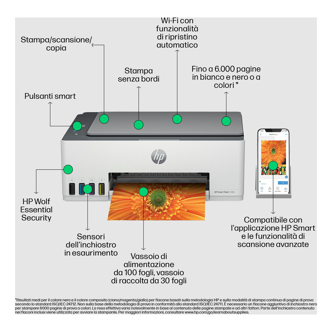 HP Smart Tank 5105 Wireless All-in-One Colore Stampante, Fotocopiatrice, scanner. Tecnologia di stampa: Getto termico d’inchiostro, Stampa: Stampa a colori, Risoluzione massima: 4800 x 1200 DPI, Velocità di stampa (colore, qualità normale, A4/US Letter): 5 ppm. Copia: Copia a colori, Risoluzione di copia massima: 600 x 600 DPI. Scansione: Scansione a colori, Risoluzione di scansione ottica: 1200 x 1200 DPI. Massimo formato carta serie ISO A: A4. Wi-Fi. Stampa diretta. Colore del prodotto: Grigio