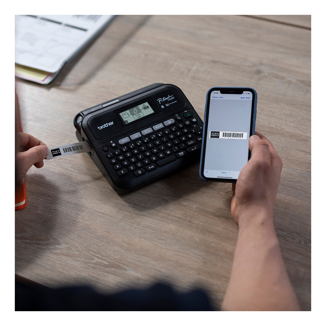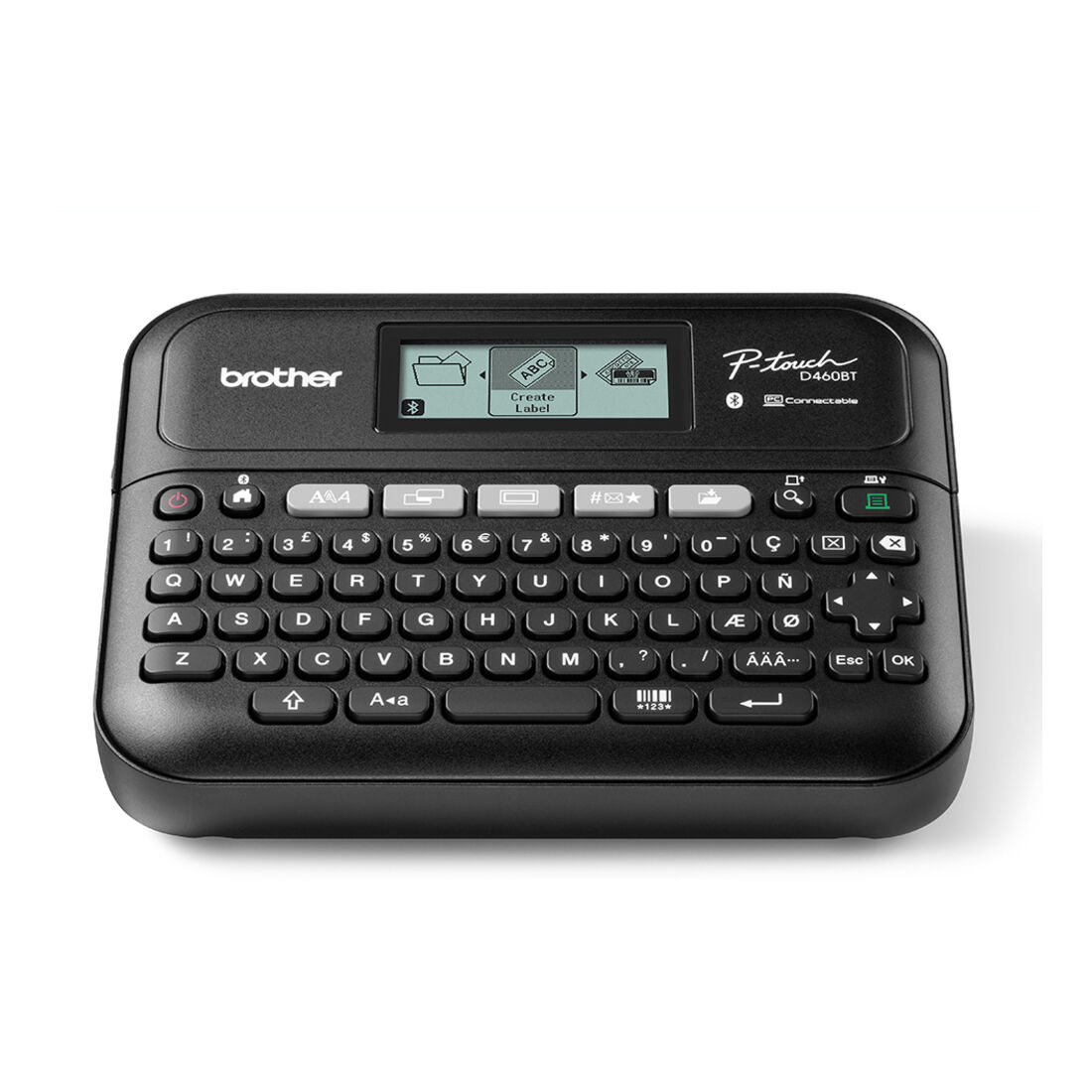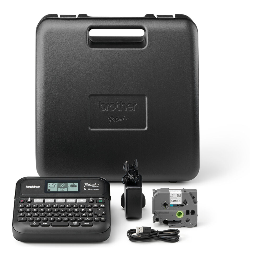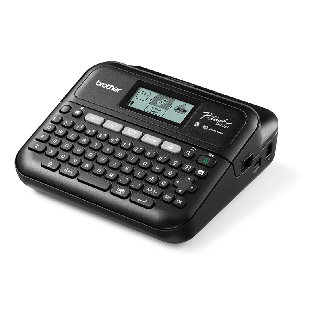 Brother PT-D460BTVP. Tecnologia di stampa: Trasferimento termico, Risoluzione massima: 180 x 180 DPI, Velocità di stampa: 30 mm/s. Tecnologia di connessione: Con cavo e senza cavo, Bluetooth, Versione Bluetooth: 5.0, Porta USB. Struttura tastiera: QWERTY. Tipo nastro: TZe. Colore del prodotto: Nero
