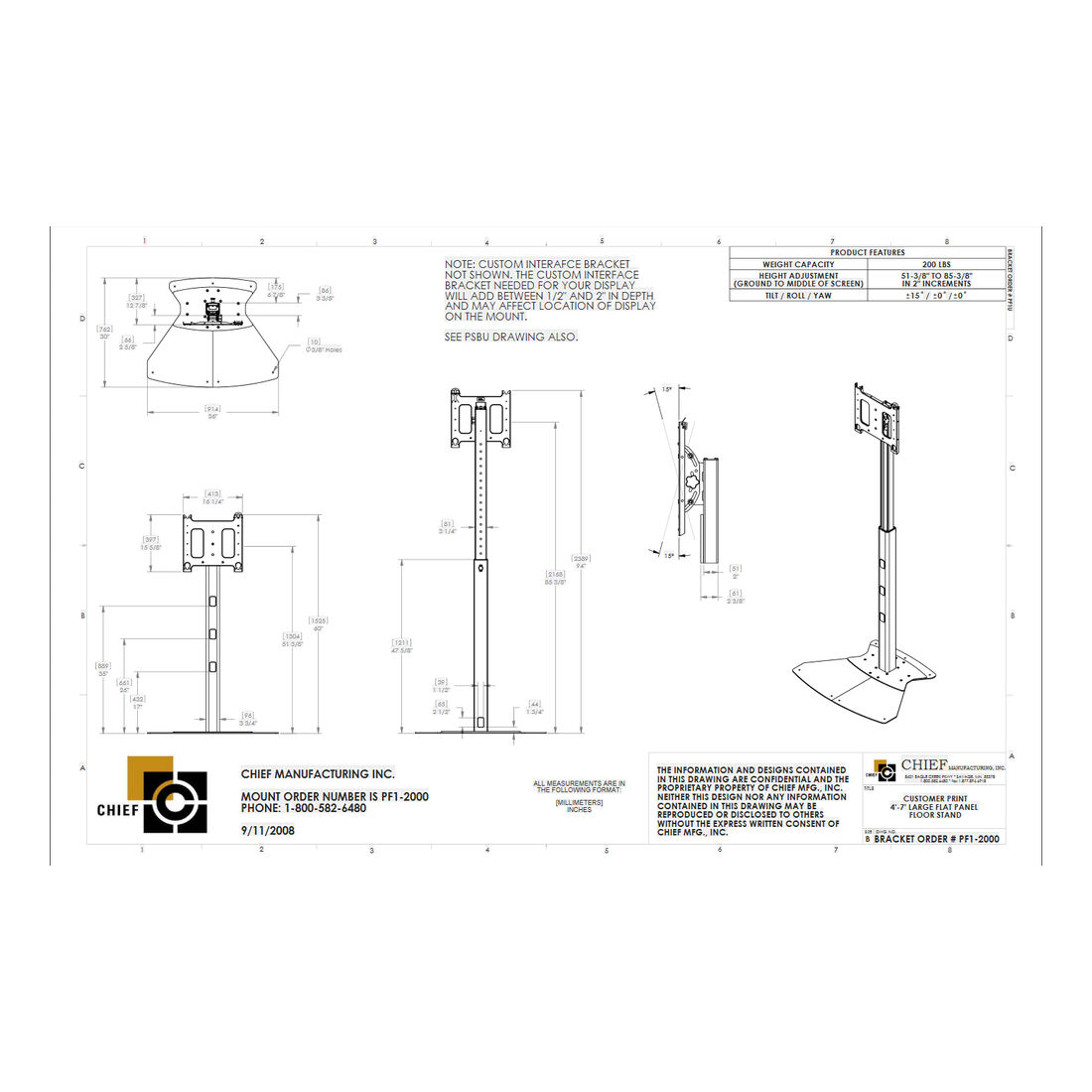 Chief PF1UB. Peso massimo (capacità): 90,7 kg, Capienza minima dimensioni dello schermo: 106,7 cm (42″), Capienza massima dimensioni dello schermo: 190,5 cm (75″), Compatibilità interfaccia di montaggio (min): 200 x 200 mm, Compatibilità interfaccia di montaggio (max): 800 x 400 mm. Regolazione altezza, Inclinazione: -15 – 15°. Colore del prodotto: Nero
