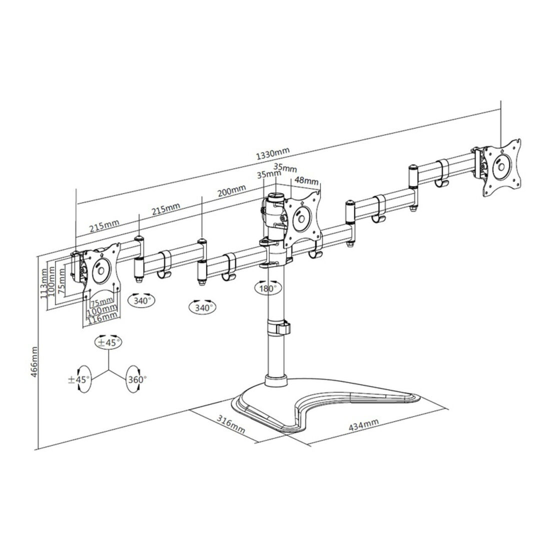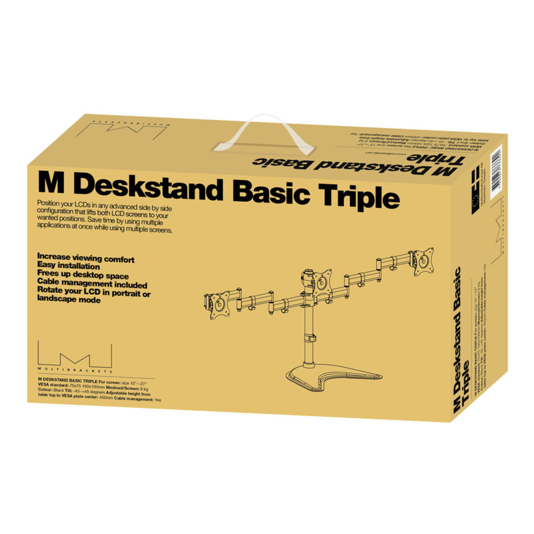 Multibrackets 3392. Montaggio: Libera installazione, Peso massimo (capacità): 24 kg, Capienza minima dimensioni dello schermo: 38,1 cm (15″), Capienza massima dimensioni dello schermo: 68,6 cm (27″), Compatibilità interfaccia di montaggio (min): 75 x 75 mm, Compatibilità interfaccia di montaggio (max): 100 x 100 mm. Regolazione altezza, Angolo di rotazione: -45 – 45°, Inclinazione: -45 – 45°. Colore del prodotto: Nero