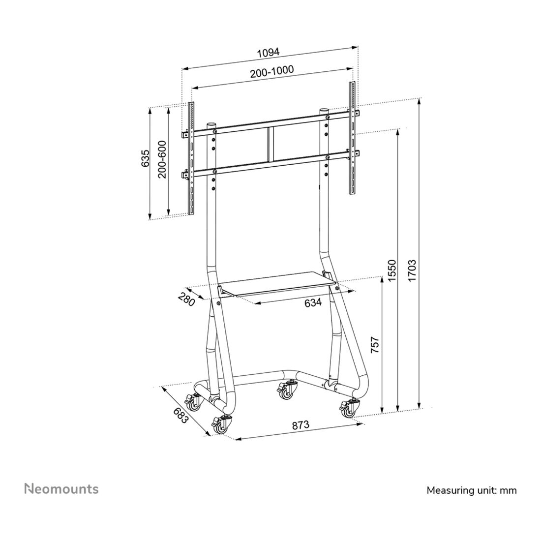 Neomounts NS-M3800BLACK Carrello TV 60-100″. Peso massimo (capacità): 100 kg, Capienza minima dimensioni dello schermo: 152,4 cm (60″), Capienza massima dimensioni dello schermo: 2,54 m (100″), Compatibilità interfaccia di montaggio (min): 200 x 200 mm, Compatibilità interfaccia di montaggio (max): 1000 x 600 mm. Regolazione altezza. Colore del prodotto: Nero