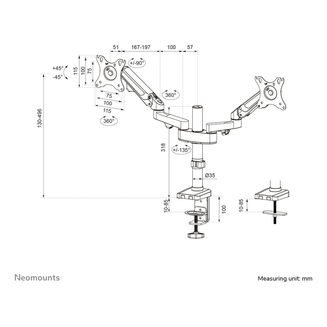Neomounts DS70-750BL2 Braccio per monitor 17-27″ – molla a gas. Montaggio: Morsetto/occhiello, Capienza minima dimensioni dello schermo: 43,2 cm (17″), Capienza massima dimensioni dello schermo: 68,6 cm (27″), Compatibilità interfaccia di montaggio (min): 75 x 75 mm, Compatibilità interfaccia di montaggio (max): 100 x 100 mm. Regolazione altezza, Angolo di rotazione: -90 – 90°, Inclinazione: -45 – 45°. Colore del prodotto: Nero