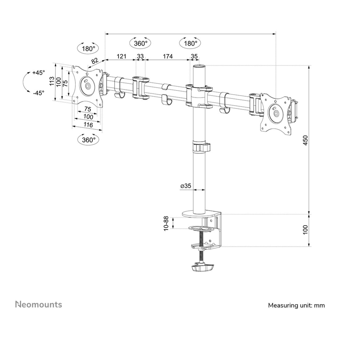 Neomounts NM-D135DSILVER Braccio per monitor 10-27″. Montaggio: Morsetto/occhiello, Capienza minima dimensioni dello schermo: 25,4 cm (10″), Capienza massima dimensioni dello schermo: 68,6 cm (27″), Compatibilità interfaccia di montaggio (min): 75 x 75 mm, Compatibilità interfaccia di montaggio (max): 100 x 100 mm. Regolazione altezza, Inclinazione: 0 – 90°. Colore del prodotto: Argento