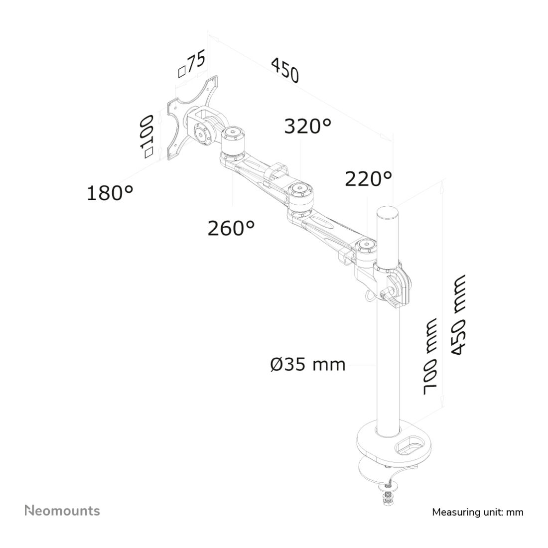 Neomounts FPMA-D935G Braccio per monitor 10-30″. Montaggio: Occhiello, Peso massimo (capacità): 10 kg, Capienza minima dimensioni dello schermo: 25,4 cm (10″), Capienza massima dimensioni dello schermo: 76,2 cm (30″), Compatibilità interfaccia di montaggio (min): 75 x 75 mm, Compatibilità interfaccia di montaggio (max): 100 x 100 mm. Regolazione altezza, Inclinazione: 0 – 180°. Colore del prodotto: Argento