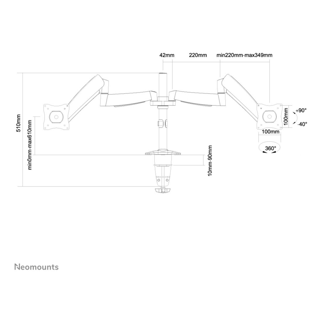 Neomounts FPMA-D950D Braccio per monitor 10-27″ – molla a gas. Montaggio: Morsetto/occhiello, Peso massimo (capacità): 9 kg, Capienza minima dimensioni dello schermo: 25,4 cm (10″), Capienza massima dimensioni dello schermo: 68,6 cm (27″), Compatibilità interfaccia di montaggio (min): 75 x 75 mm, Compatibilità interfaccia di montaggio (max): 100 x 100 mm. Regolazione altezza, Angolo di rotazione: 0 – 180°, Inclinazione: 0 – 130°. Colore del prodotto: Argento