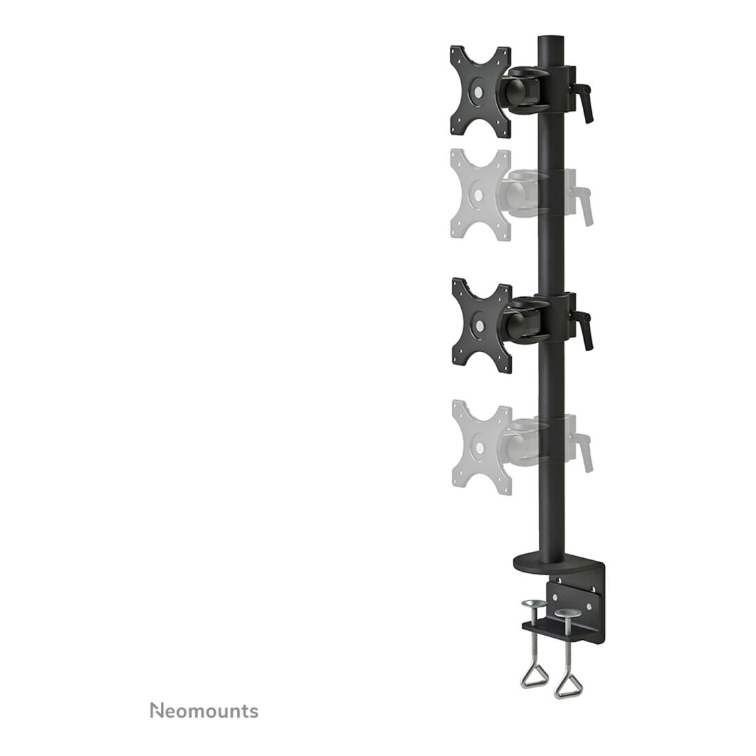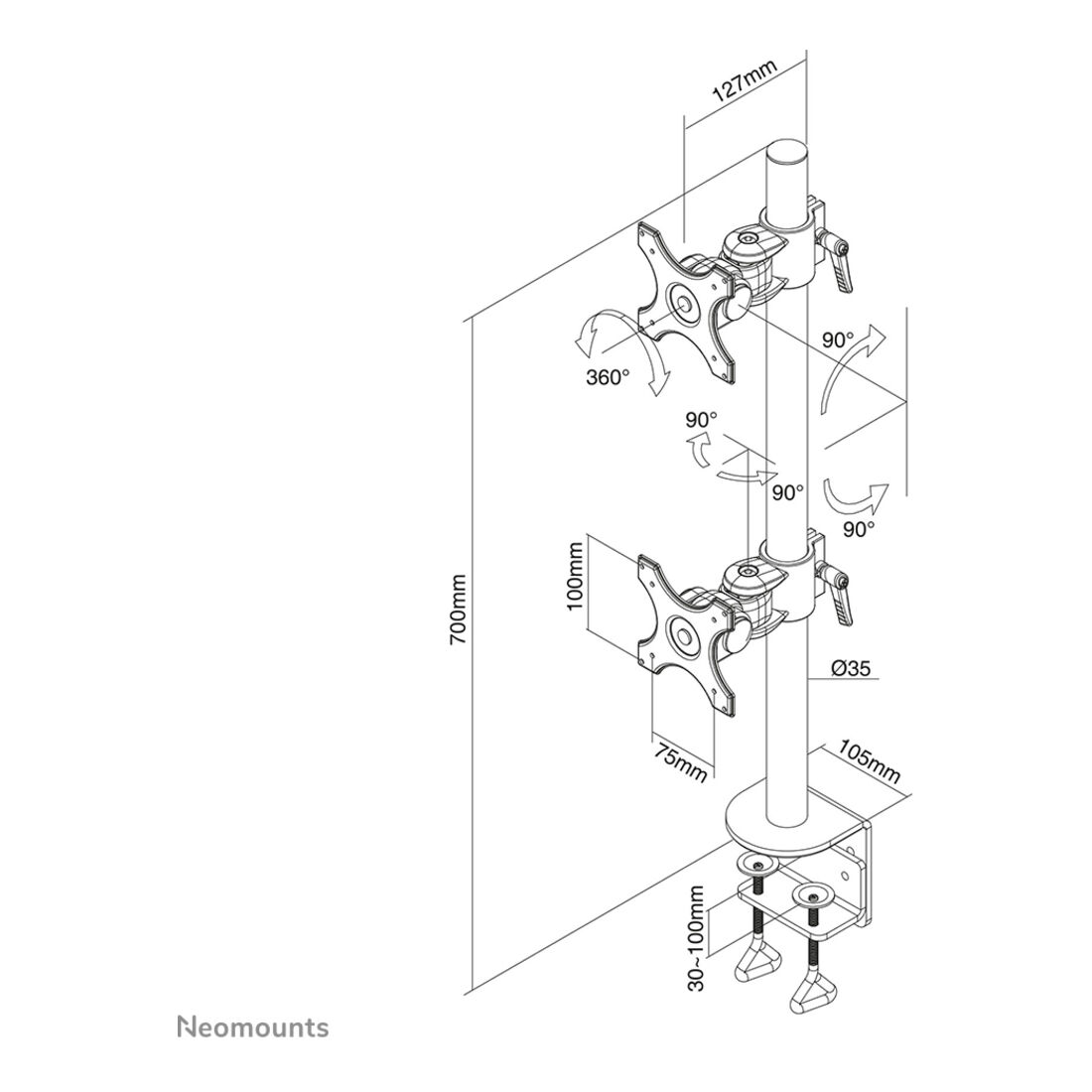 Neomounts FPMA-D700DV Braccio per monitor 10-27″. Montaggio: Morsa, Capienza minima dimensioni dello schermo: 25,4 cm (10″), Capienza massima dimensioni dello schermo: 68,6 cm (27″), Compatibilità interfaccia di montaggio (min): 75 x 75 mm, Compatibilità interfaccia di montaggio (max): 100 x 100 mm. Regolazione altezza, Inclinazione: 0 – 180°. Colore del prodotto: Nero
