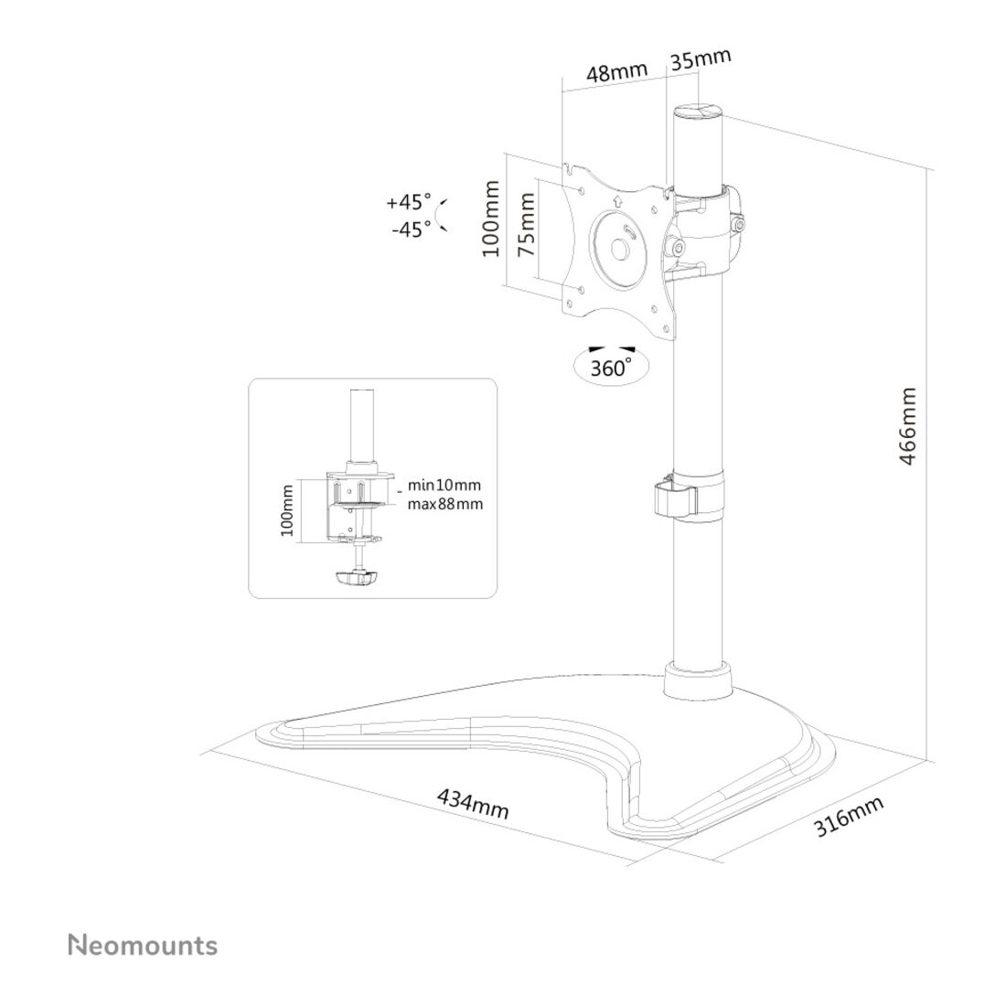 Neomounts NM-D335BLACK Supporto per monitor 10-30″. Montaggio: Morsetto/indipendente/passacavo, Peso massimo (capacità): 10 kg, Capienza minima dimensioni dello schermo: 25,4 cm (10″), Capienza massima dimensioni dello schermo: 76,2 cm (30″), Compatibilità interfaccia di montaggio (min): 75 x 75 mm, Compatibilità interfaccia di montaggio (max): 100 x 100 mm. Regolazione altezza, Angolo di rotazione: -45 – 45°, Inclinazione: -45 – 45°. Colore del prodotto: Nero